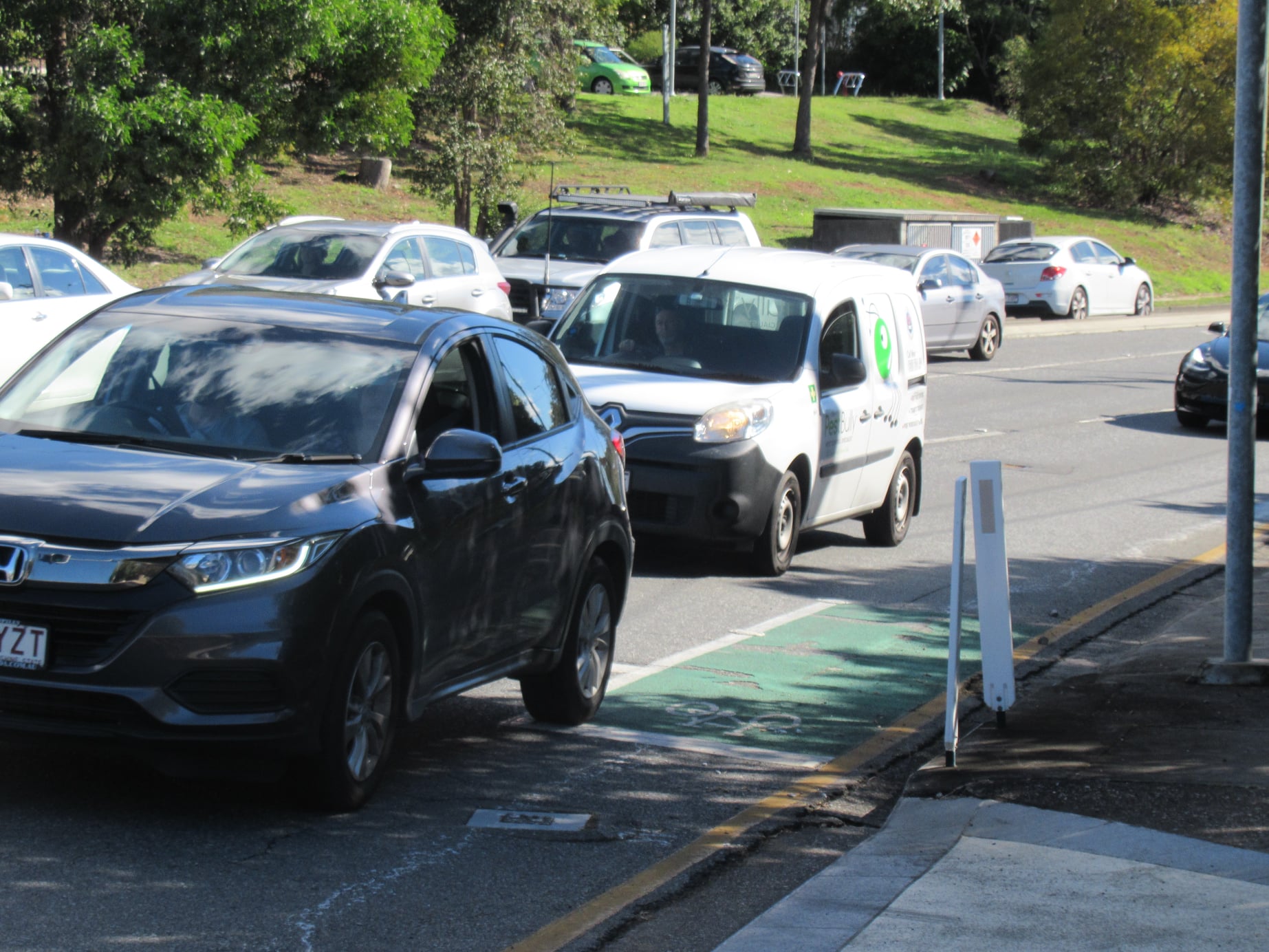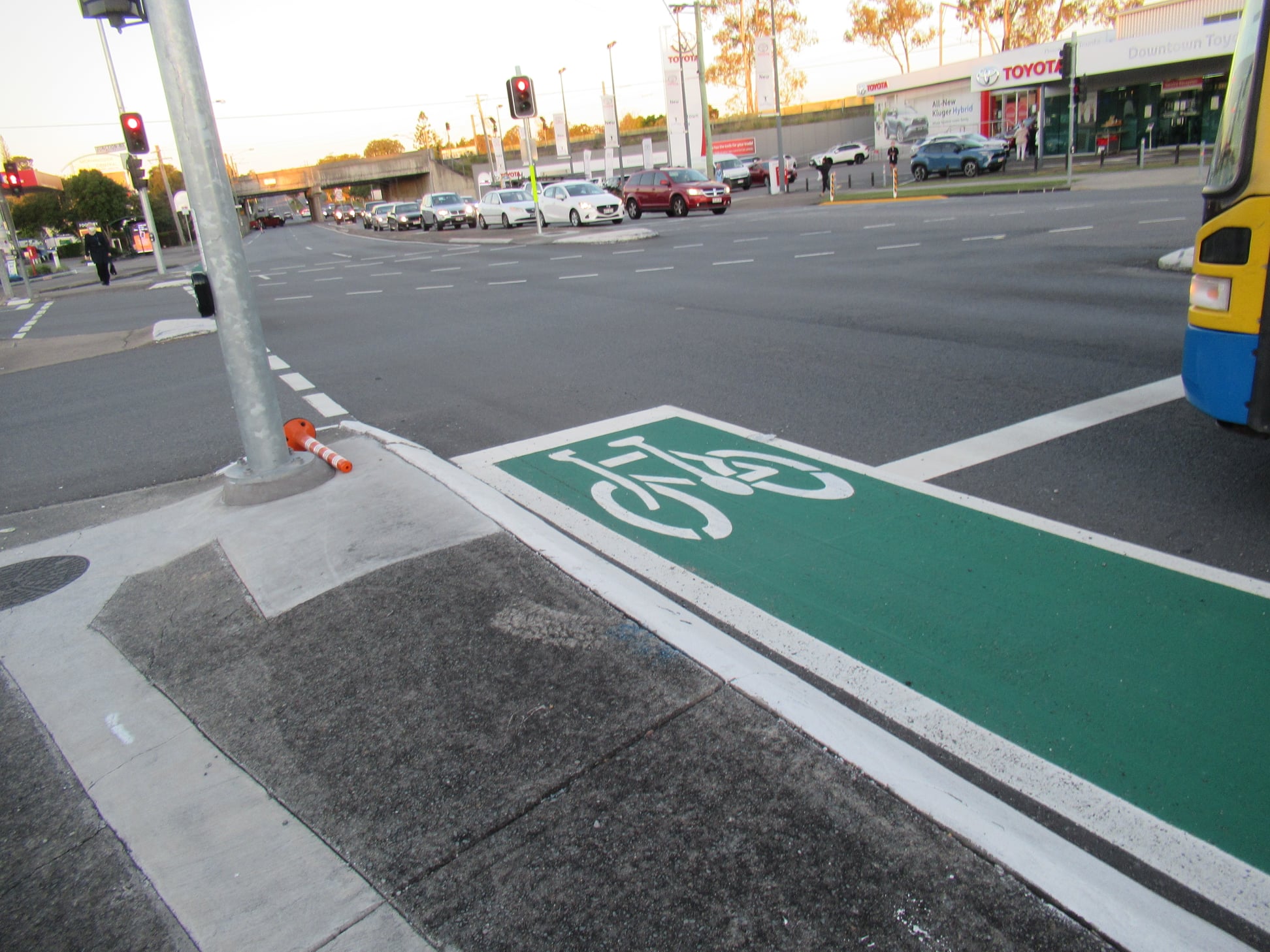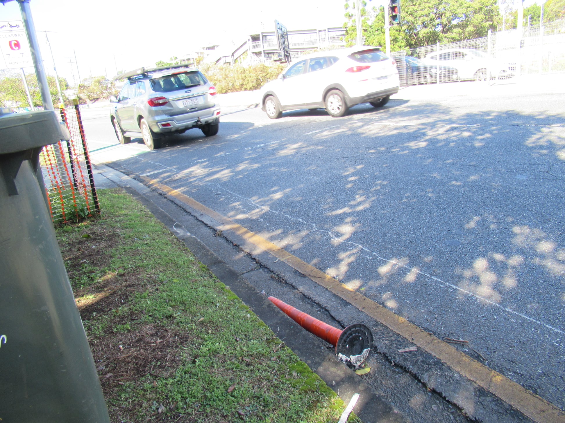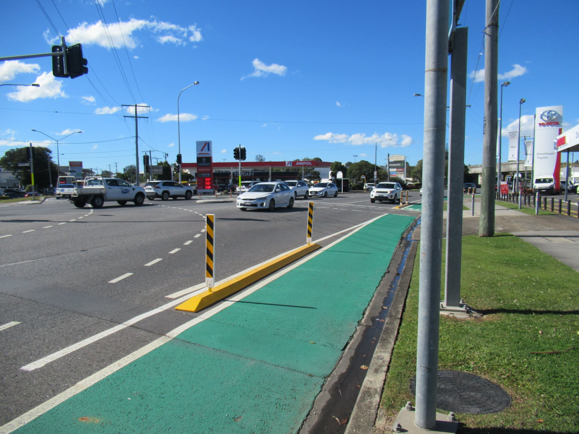A little further east, at the intersection of Wynnum Rd and Junction Rd, we can report that two of the bollards there are down. Are we feeling protected?