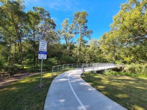 This bridge completes one of the missing links in the pathway along Cedar Creek. Ultimately we’d like to see a continuous pathway network from the Ferny Grove Station and the end of the Kedron Brook Bikeway to the new Ellendale suburb and eventually out to Enoggera Dam and Bellbird Grove.
