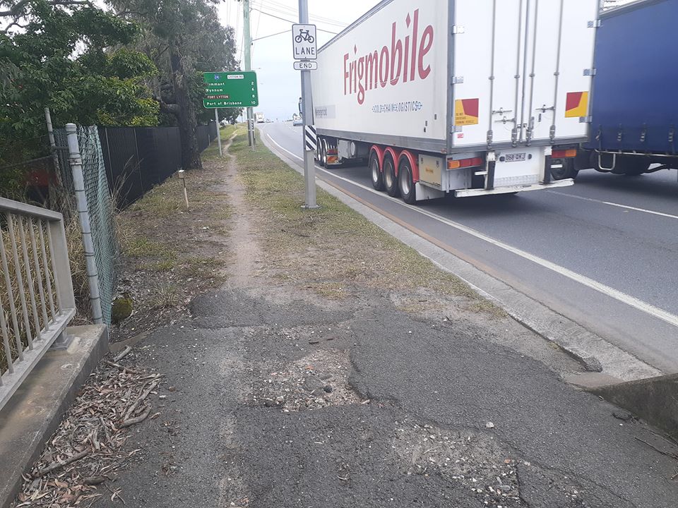 Most of the roads in the eastern suburbs of Brisbane are the responsibility of Brisbane City Council. But Lytton Rd, Murarrie east from the Gateway Motorway is one of the few exceptions—it’s a Queensland Government asset. People want to walk and ride this way—in fact they rely on it to get to work. But currently their choice is between the dirt (mud?) shoulder, or mixing with trucks on the road.