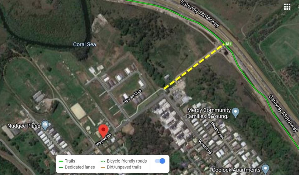 In happier news, thanks to our spotter on the Gateway North Bikeway at Nudgee, we can show you the first signs of construction work on the link to Weyers Rd. According to Council’s web page, work is expected to take approximately three months to complete, weather and site conditions permitting.