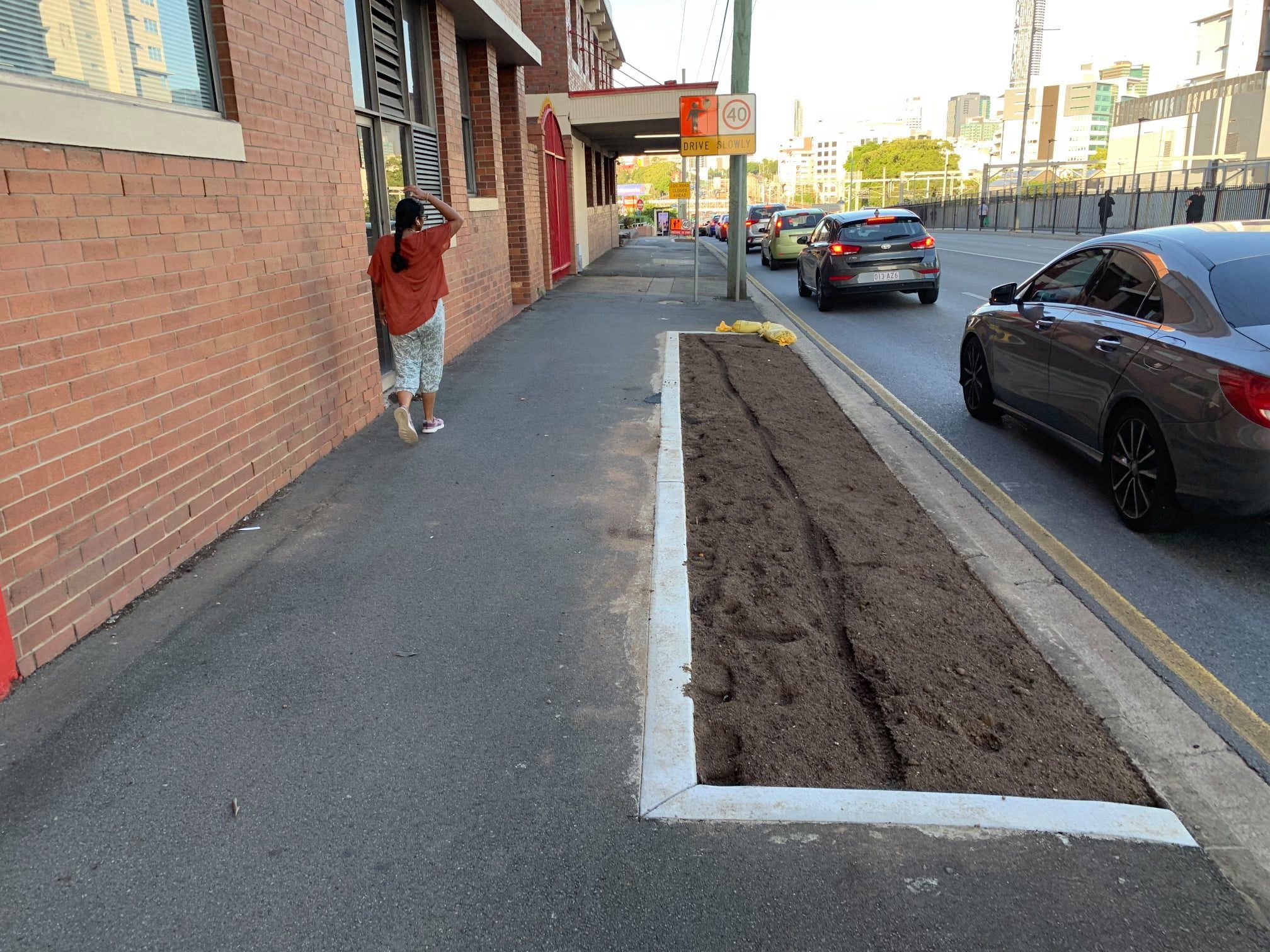 The latest footpath narrowing is on Milton Road outside the XXXX Brewery. This is a busy footpath used by rail and bus commuters as well as people walking to nearby businesses. The new garden beds already have footprints and tyre tracks in the loose soil showing people need this space to get around.