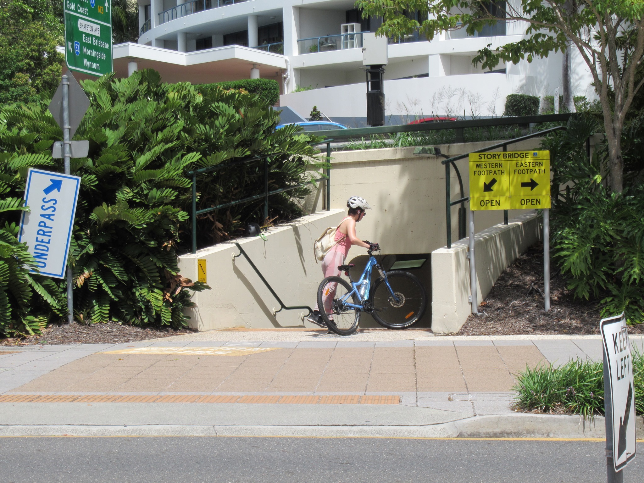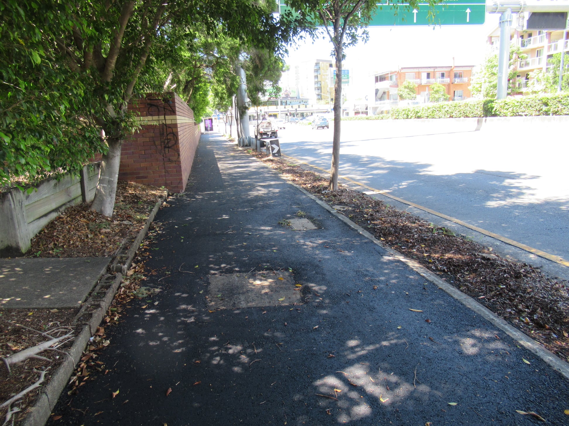 Just to the east, cyclists recently found a pleasant little surprise: the footpath along Shafston Ave, Kangaroo Point between Thorn St and Wellington Rd has been resurfaced. This is actually supposed to be a principal cycle route. It’s still too narrow to cater for much bike traffic as well as pedestrian traffic, but at least it’s no longer horribly lumpy.