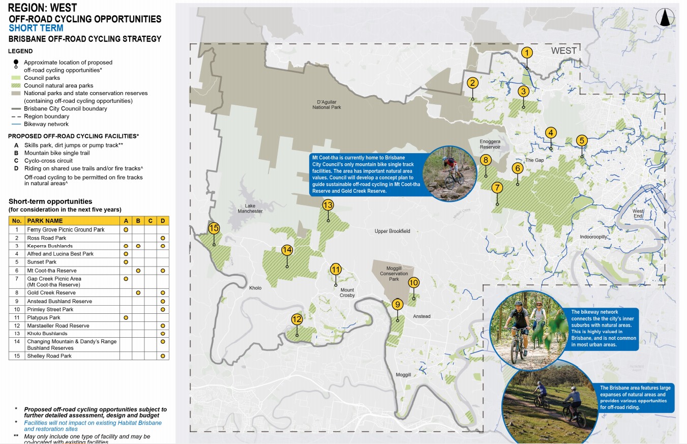 In the Western suburbs, the strategy proposes potential mountain bike trails in Keperra Bushlands, Mt Coot-tha Reserve (which already has numerous tracks), and Gold Creek Reserve in the short term, and longer term in Mt Nebo Reserve, Kholo Bushlands, Changing Mountain and Dandy’s Range Bushland Reserve and Shelley Road Park.