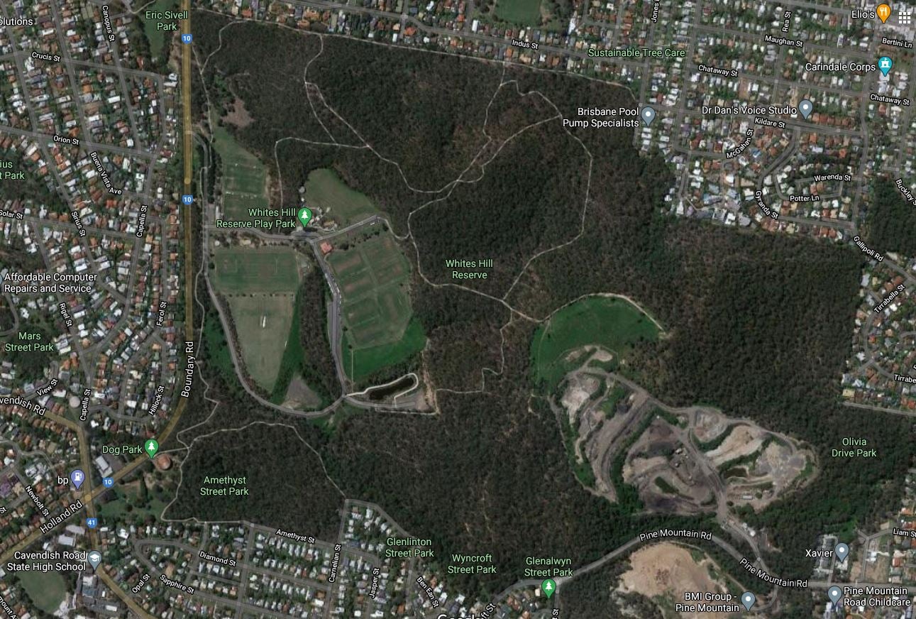 This would potentially also enable access to recreational facilities in the reserve for people from surrounding suburbs (Carina Heights, Camp Hill, Carindale) without having to drive around the park to enter from Boundary Rd. The only cycle track currently in the reserve is the shared path inside the western edge that roughly parallels Boundary Rd. Pine Mountain Road, which runs along the southern boundary of Whites Hill Reserve, is extremely hostile for cycling.