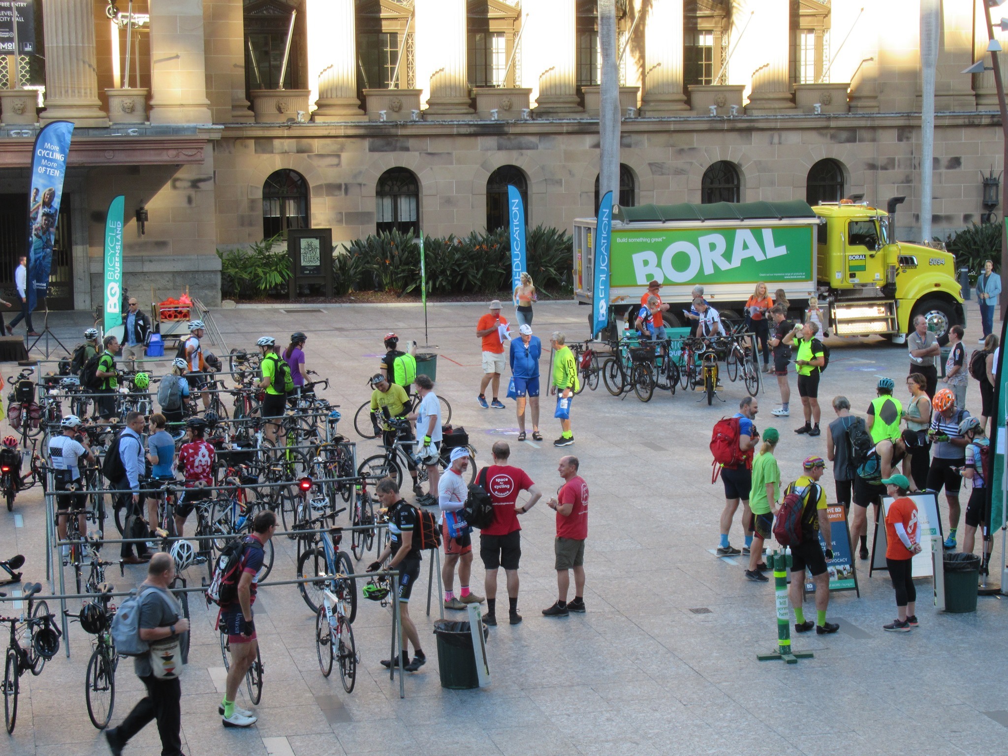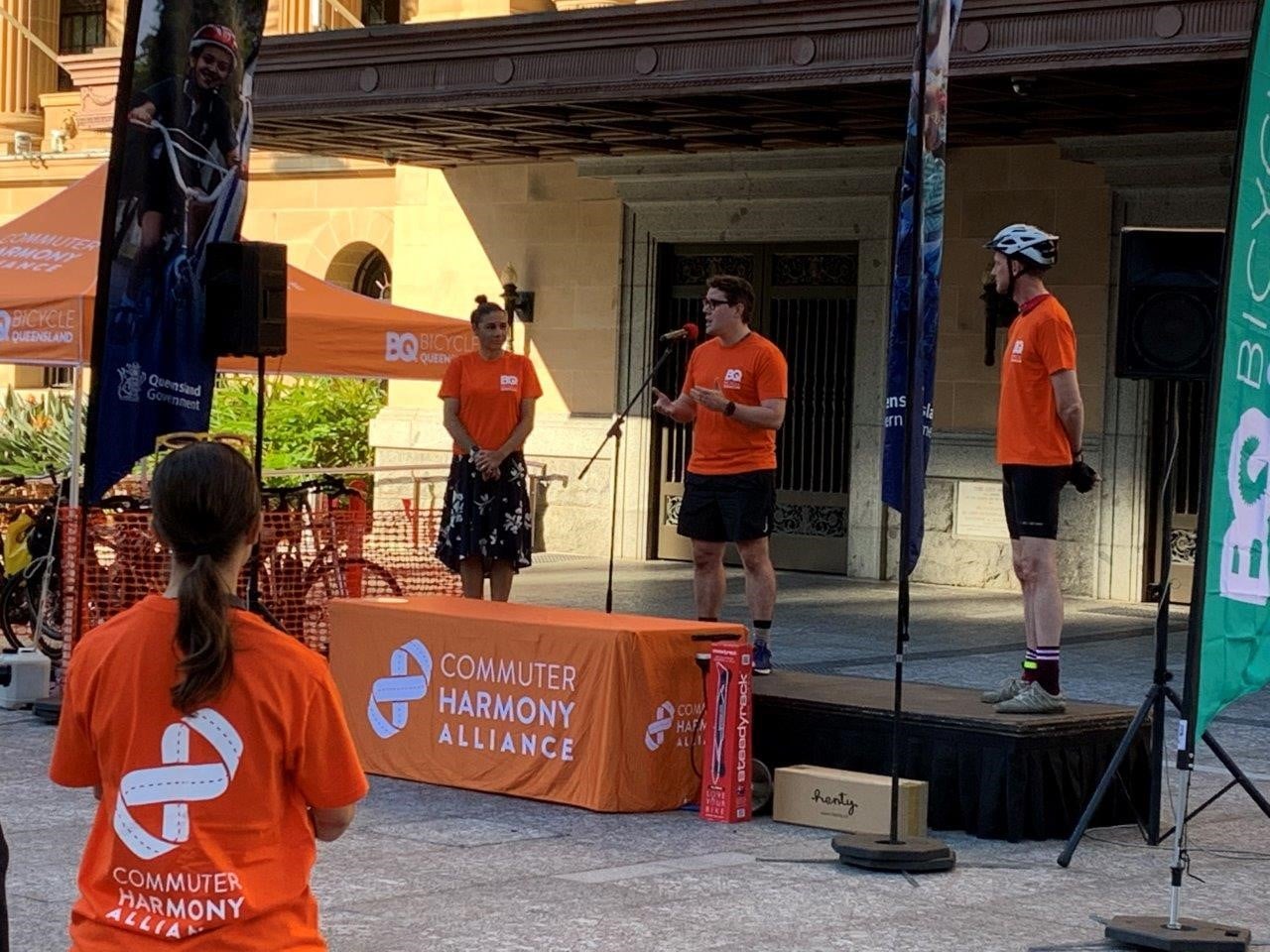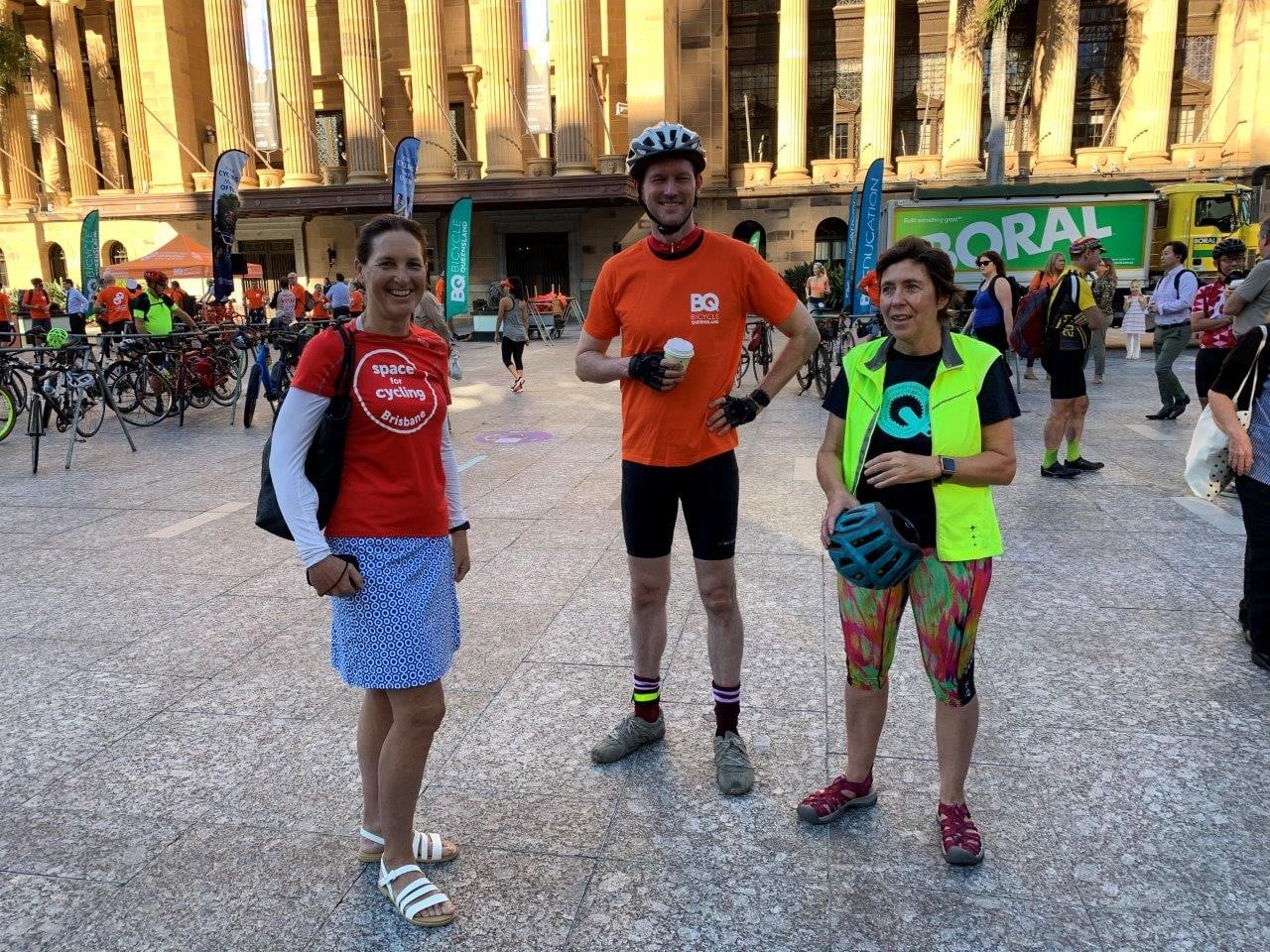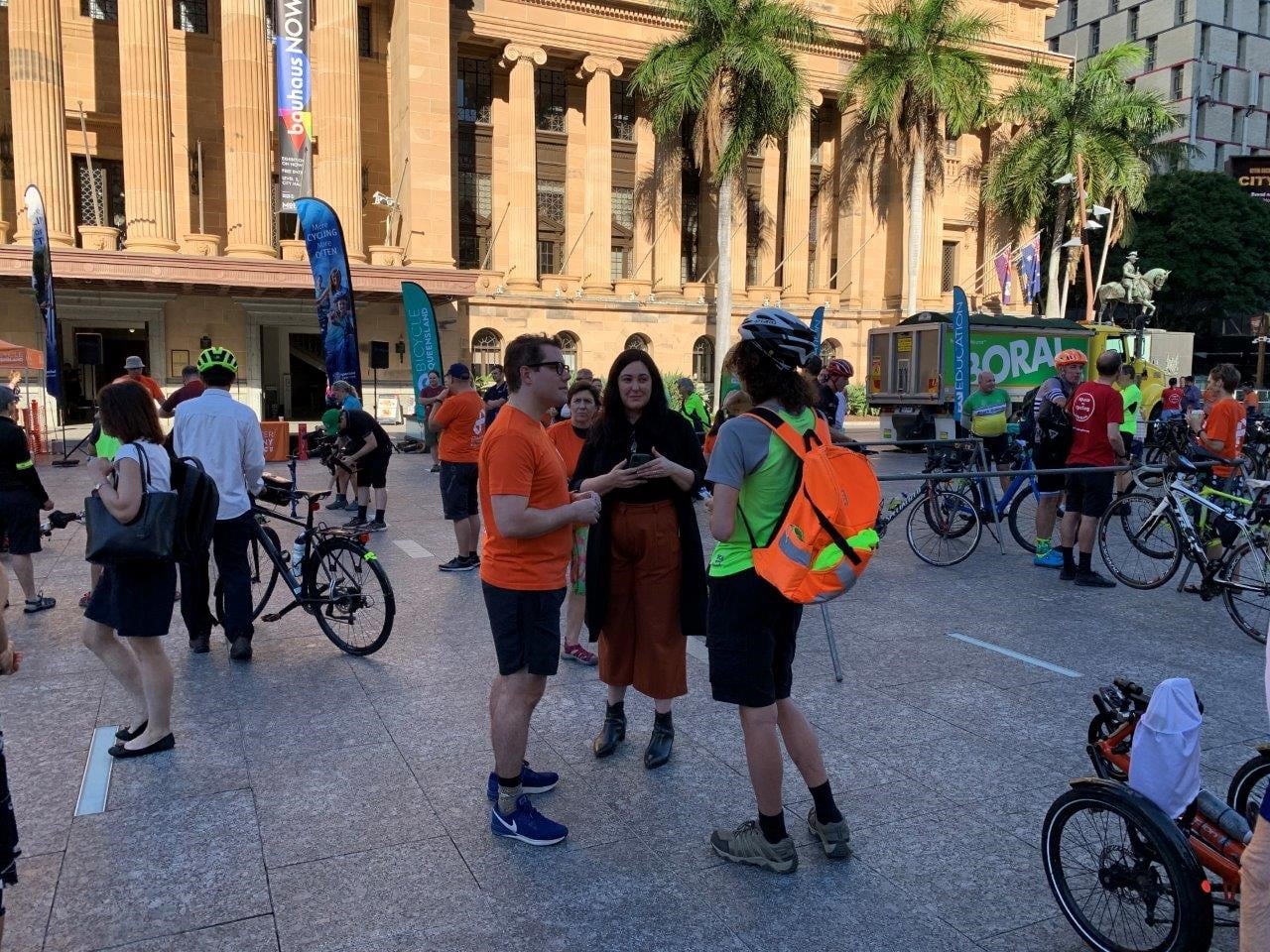 Fortunately the rain had cleared and the weather was beautiful in time for Bicycle Queensland’s Bike With Brisbane event in King George Square to launch the Commuter Harmony Alliance. It was great see a large contingent of VIP’s roll in after riding from Parliament House to City Hall via the new CityLink Cycleway. We heard from both Council’s Public and Active Transport Chair, Cr Ryan Murphy and Minister for Cycling*, Mark Bailey MP who acknowledged the role of community advocacy groups like Space4cyclingBNE and the BUGs, and highlighted how much can be achieved by working across levels of government and with the support of all major political parties – particularly when difficult decisions are required to prioritise healthy transport.