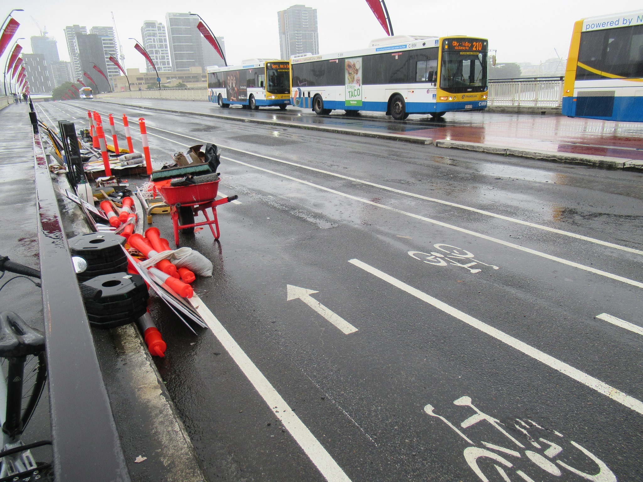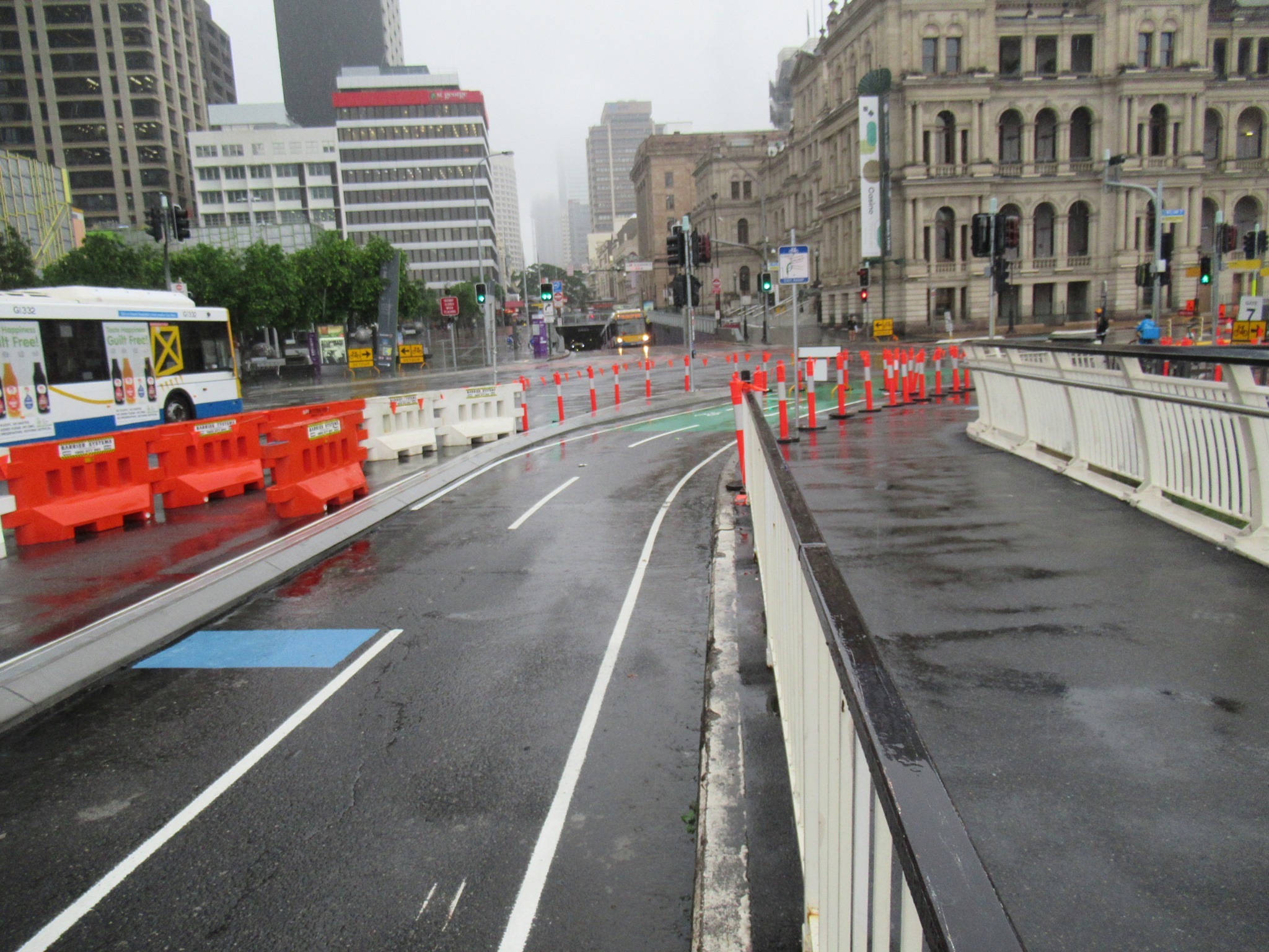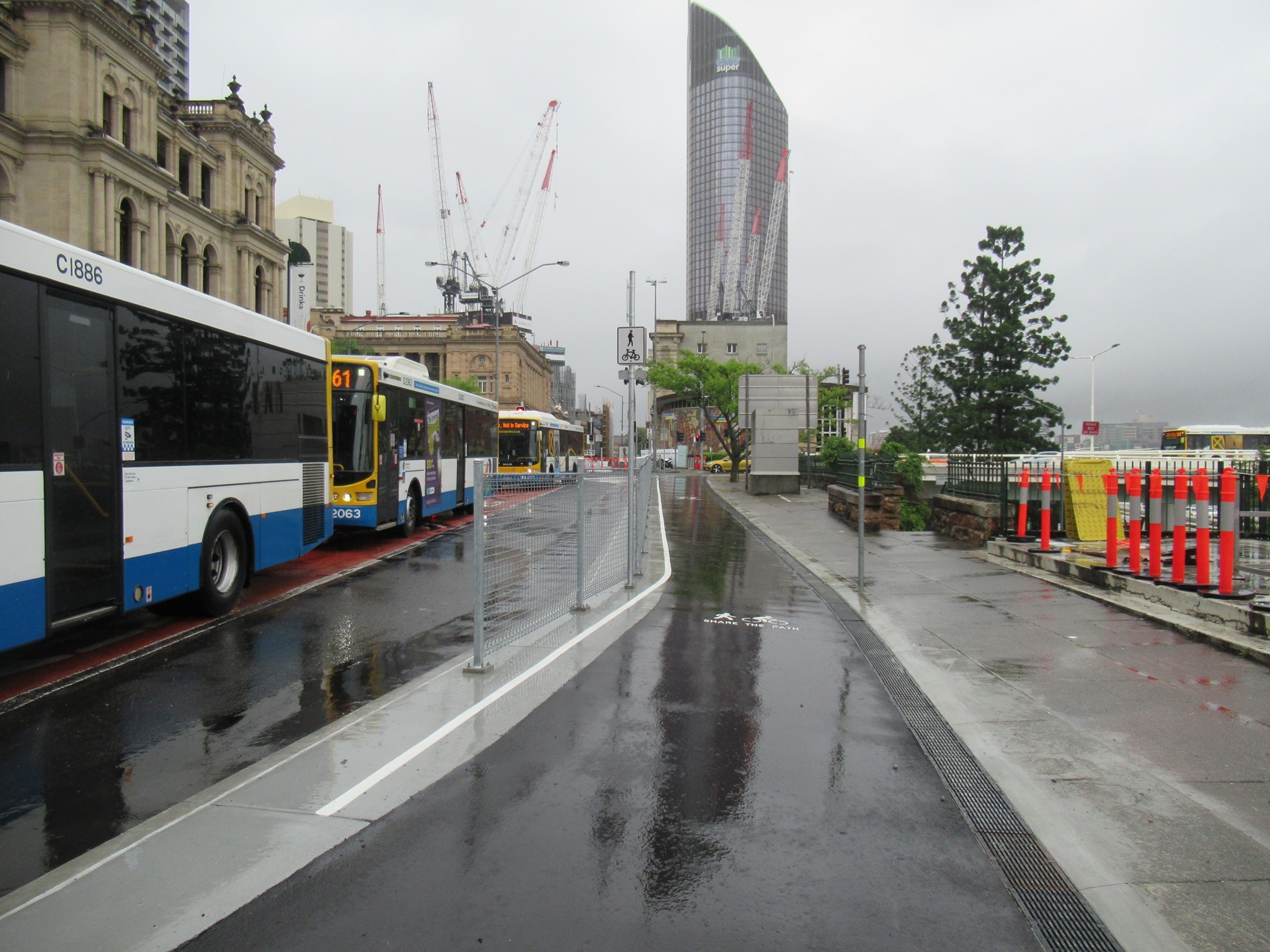 Despite the wet weather, work seemed to have been progressing well on the cycleway on Victoria Bridge and William St – to the point where we predicted it might open as early as Tuesday morning. Sadly we were too optimistic with that. (Forgive us, we’ve been campaigning for 4 years on this. Now we’re so close, we’re very impatient!)