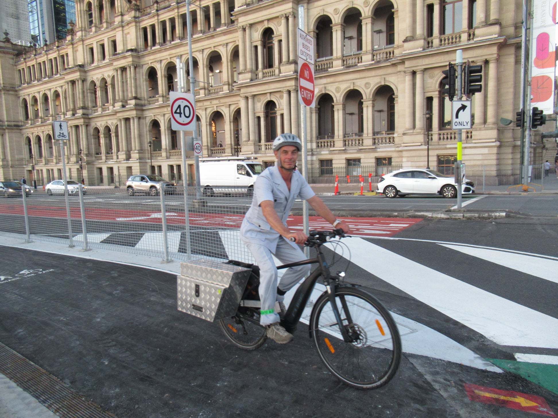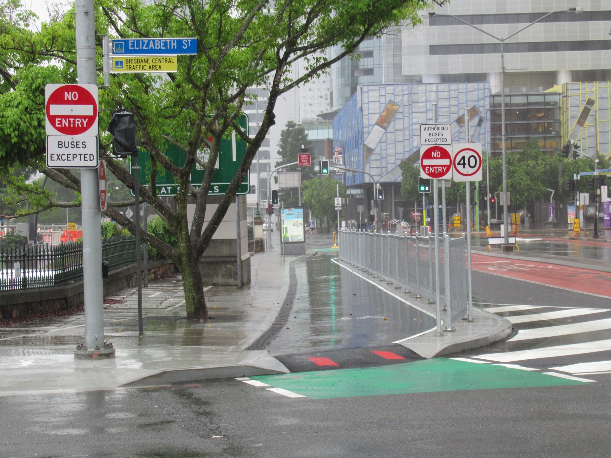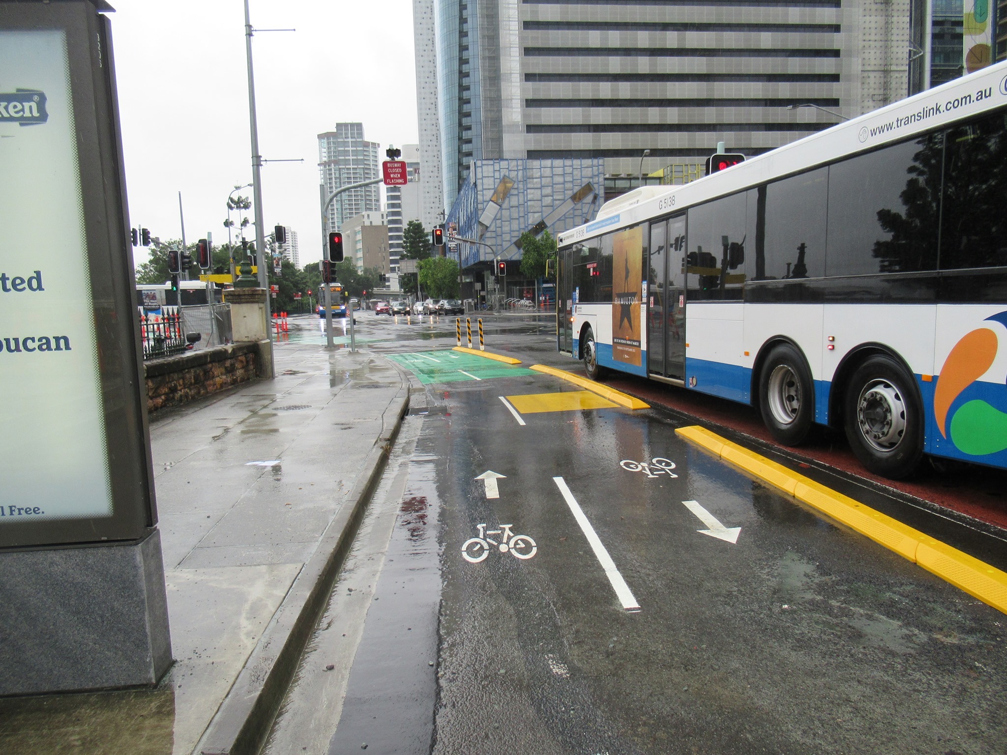 Despite the wet weather, work seemed to have been progressing well on the cycleway on Victoria Bridge and William St – to the point where we predicted it might open as early as Tuesday morning. Sadly we were too optimistic with that. (Forgive us, we’ve been campaigning for 4 years on this. Now we’re so close, we’re very impatient!)