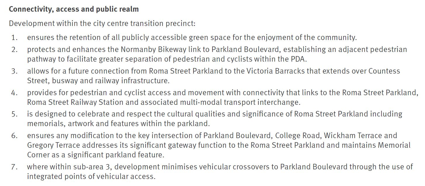 “Development within the city centre transition precinct … protects and enhances the Normanby Bikeway link to Parkland Boulevard, establishing an adjacent pedestrian pathway to facilitate greater separation of pedestrian and cyclists within the PDA.”