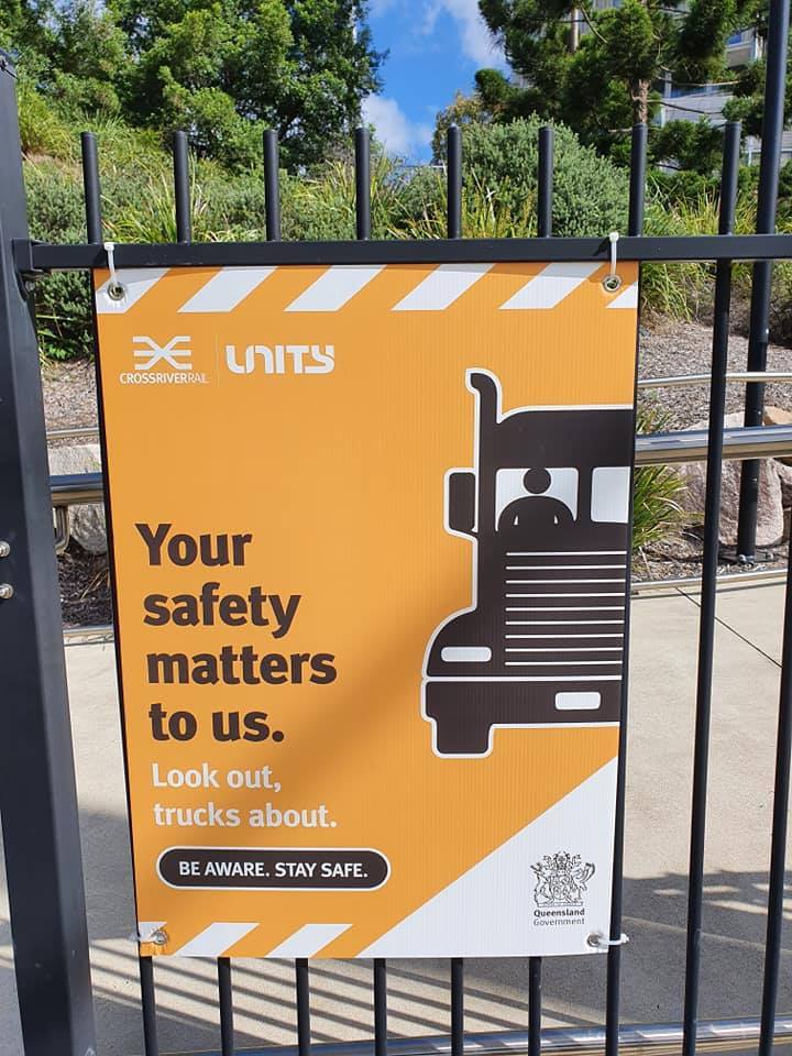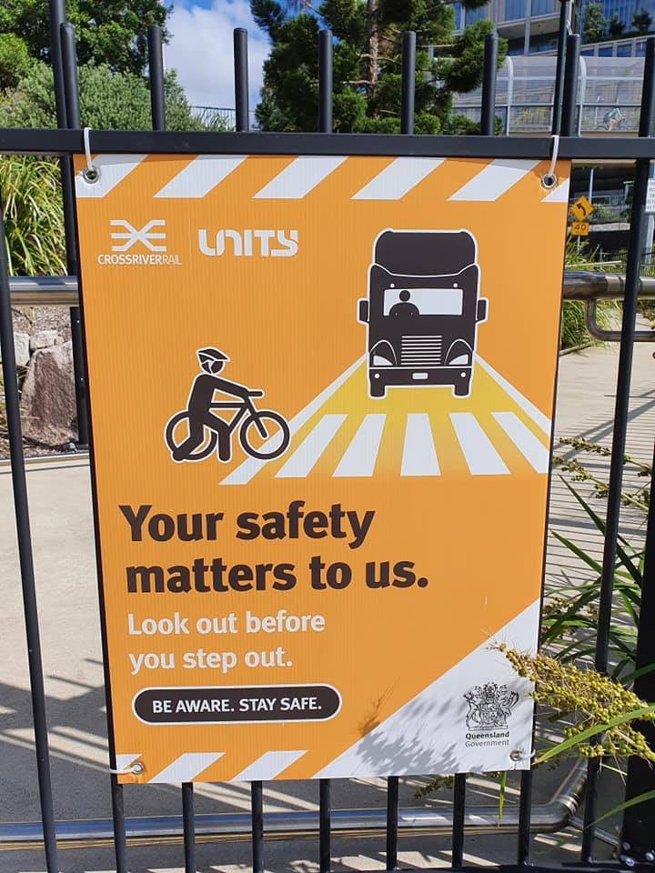 While we’re happy to see signs promoting road safety at Cross River Rail construction sites (including signs reminding drivers to watch out for vulnerable road users as they leave the sites), we would have preferred that the project adopted a Safe Systems approach from the very beginning—including requirements for safe vehicles and driver training. This is something we raised in our submissions to the Coordinator General (who must approve all project changes) and in meetings we have had with the Cross River Rail Delivery Authority.