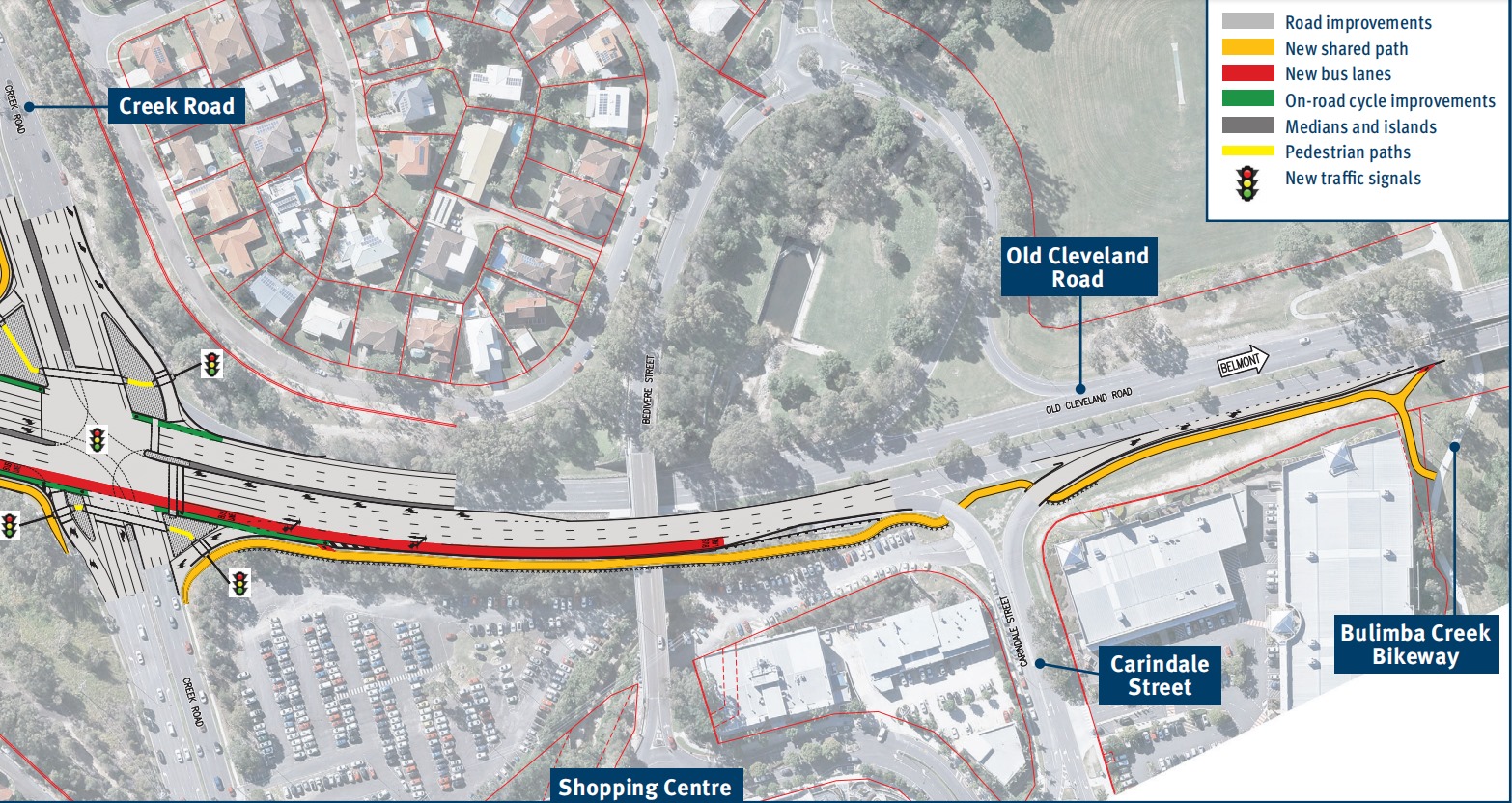 Stage 1 of the Eastern Transitway works, due to be completed in late 2021, will include 3m wide shared paths on both sides of Old Cleveland Rd between Narracott St and Creek Rd, and on the southern side of Old Cleveland Rd between Bulimba Creek and Creek Rd.