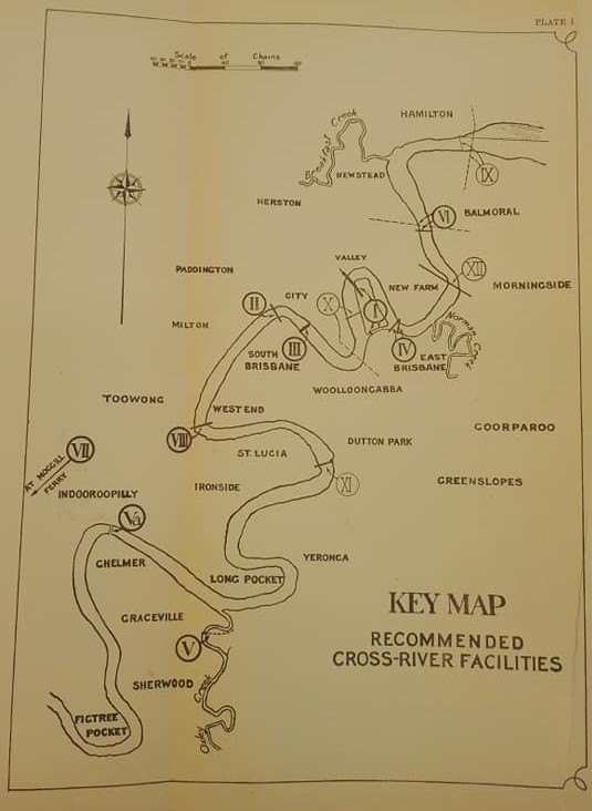 We thought perhaps Council should go back to their own archives and pull out the apparently more comprehensive review of river crossing options completed on their behalf in 1925. Roger Hawken recommended a Transporter Bridge between Bulimba and Teneriffe and later a tube, with an estimated cost of £2,000,000. Alternatively, “since the river has a long straight reach allowing of navigation, an opening bridge having 60ft clearance above high water might be considered.”