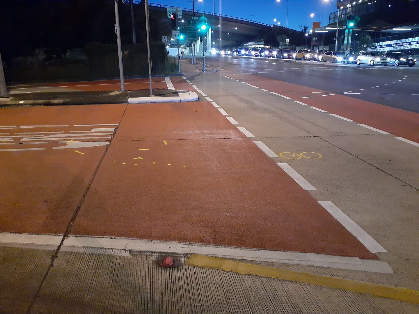 Less than a week later, the lipstick application had commenced. #FreshKermit now delineates the bike lanes on Wynnum Rd, Morningside on either side of the intersection with Junction Road. We’re still waiting for the “retrofit separation devices” (RSD) to be installed in coming days; a combination of rubber kerbs and flex posts.
