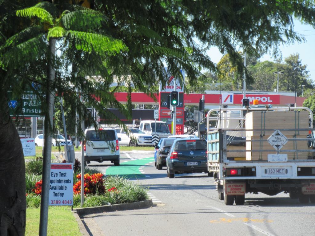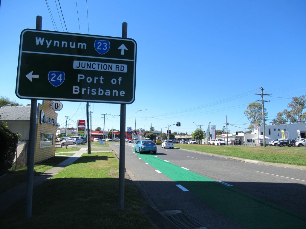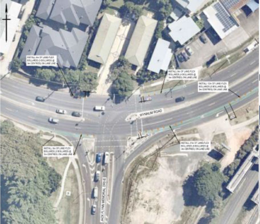 First up will be the intersection of Wynnum Road and Jack Flynn Memorial Drive – near Morningside Station. It appears from the very fuzzy diagram provided, that the flex-posts will be installed along the right hand side of the green strip approaching the intersection inbound on Wynnum Road, and along the short strip of bike lane after the intersection for both inbound and outbound riders on Wynnum Road.