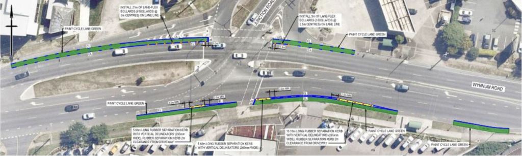 EaST BUG are baffled that anyone could look at this intersection—with its high speed slip lanes, long green strip sandwiched between lanes of fast traffic, abruptly disappearing bike lanes, and gravel pit on the escape ramp to the footpath—and think that a few flex posts in the middle of the road will help address the problems.