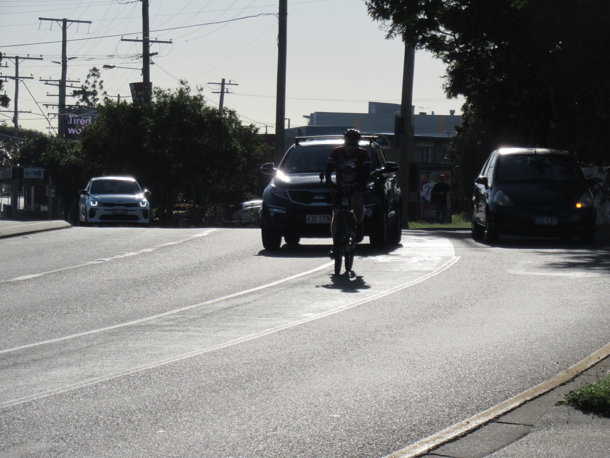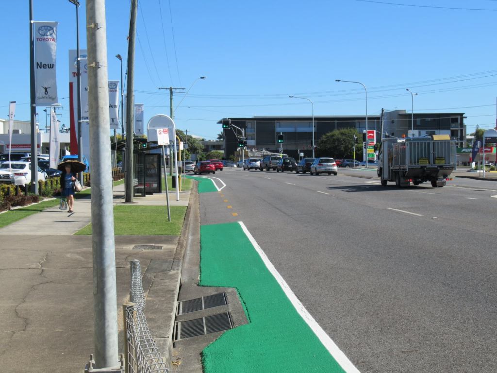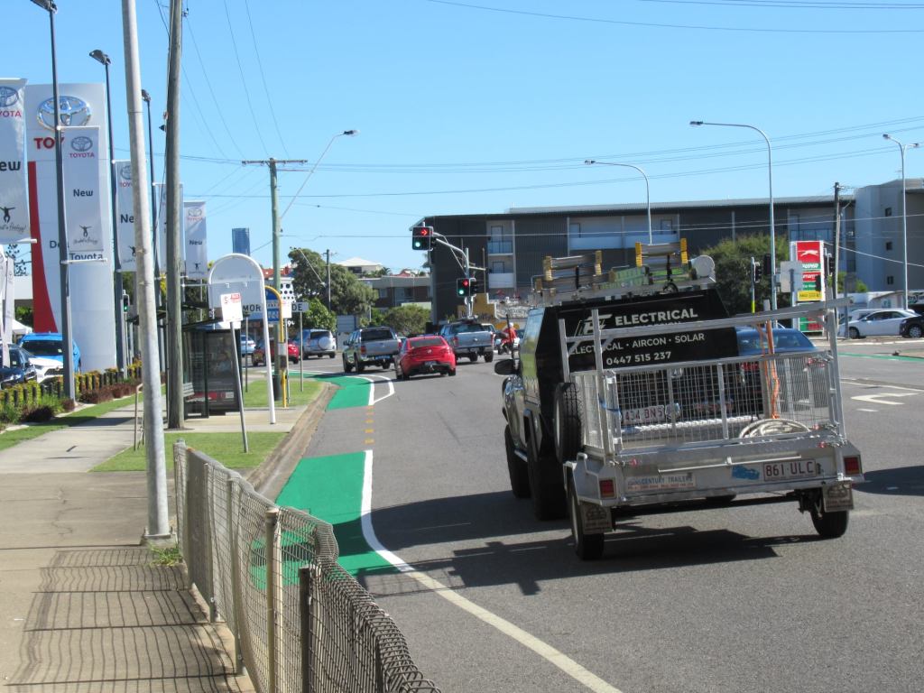 Will this green paint and plastic make you feel safer / more comfortable cycling on Wynnum Rd through Morningside? We’re not convinced.