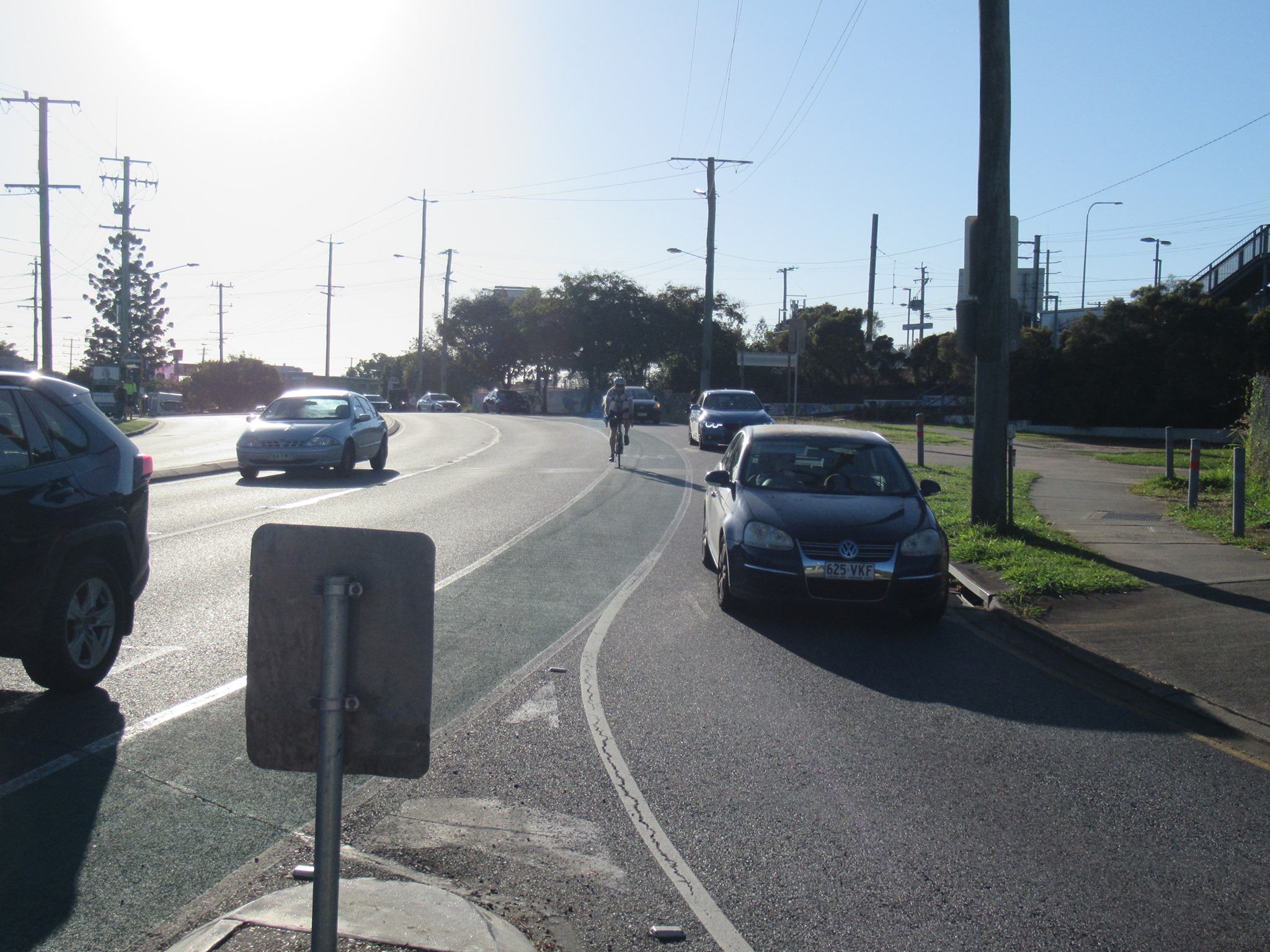 Heading west, when coming out from under the rail overpass, the left hand general lane bulges out on the approach to the intersection, whereas the cycle lane hugs the gutter, even where there are a number of drainage grates and cracks/holes in the surface.
