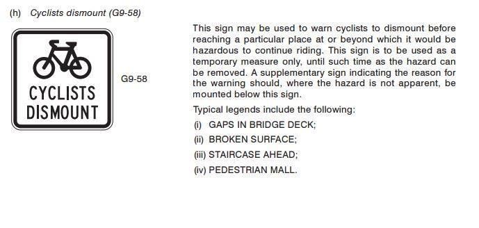 This incident underscores the importance of correct usage of “cyclists dismount” signs as set out in the Manual of uniform traffic control devices (MUTCD):