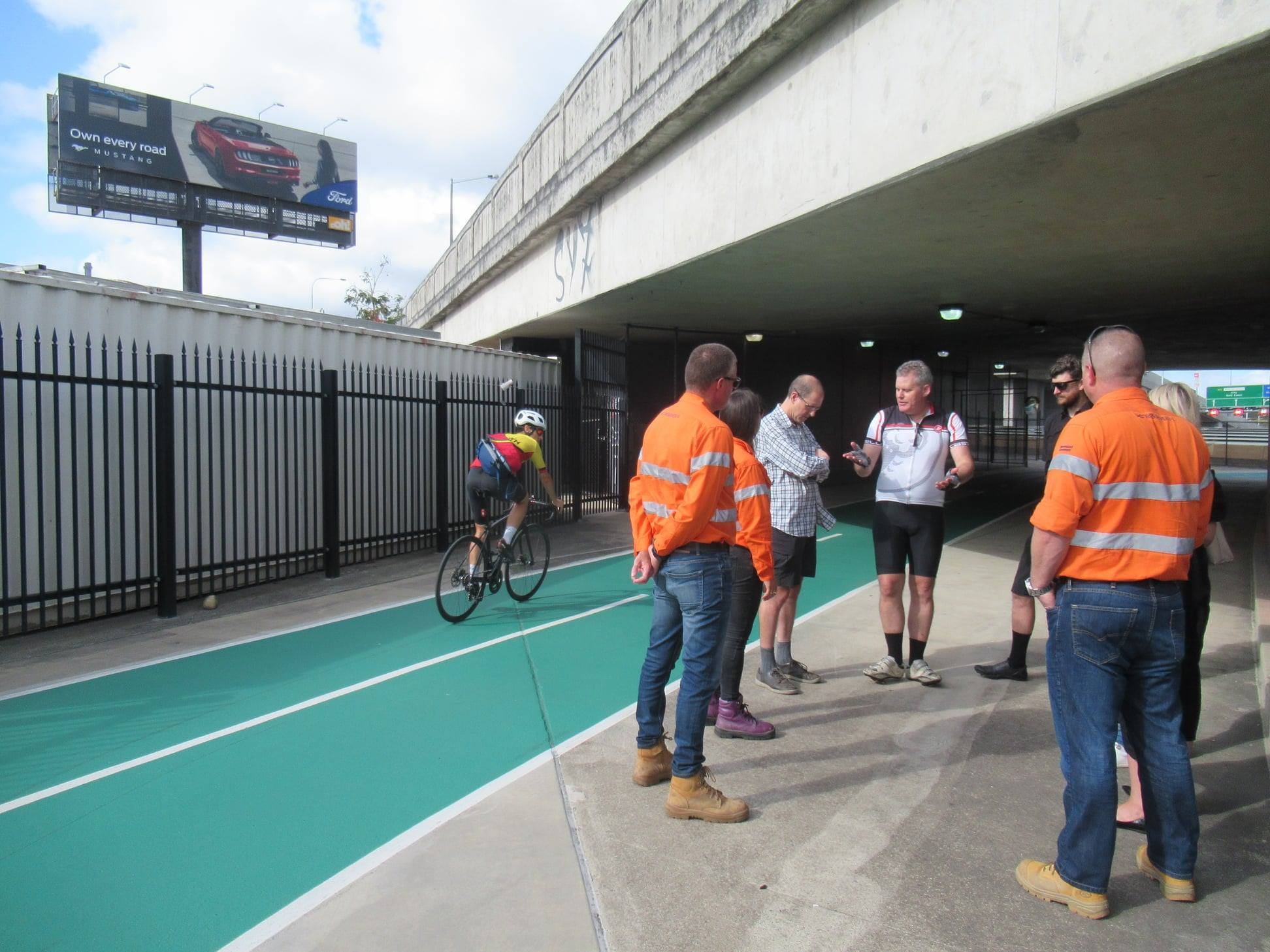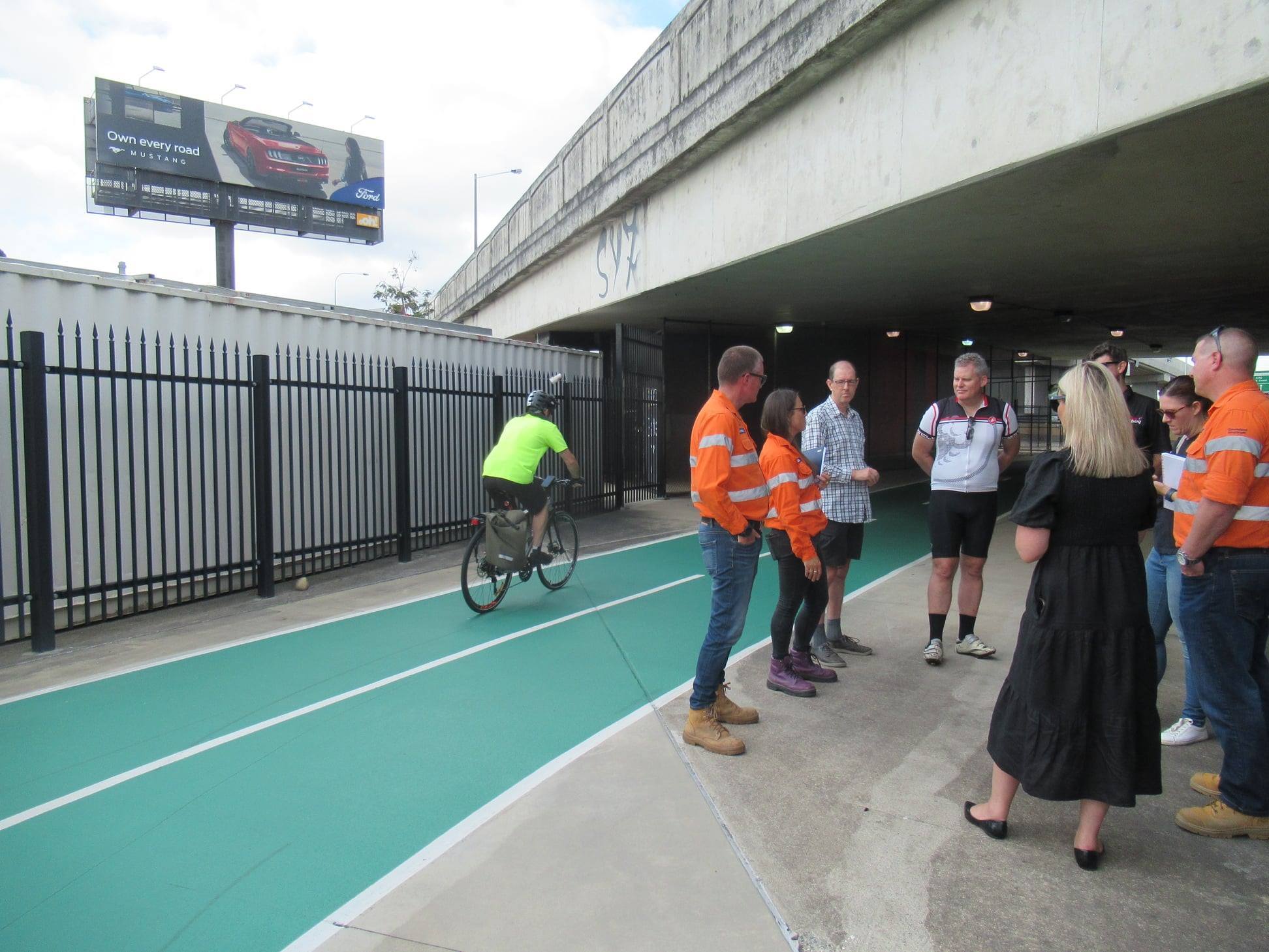 Representatives from Space4cyclingbne and Brisbane North BUG met with the Cross River Rail delivery team on site in Bowen Hills where the new entry to Exhibition Station will cross the North Brisbane Bikeway at the Bowen Bridge Road underpass. This entrance will be the main connection between the station and the RBWH when there are events at the Exhibition Grounds (such as this week), and we had flagged concerns about how the design would impact the busy arterial cycleway. A steady stream of passing cycle and scooter traffic helped underscore the importance of getting this right.