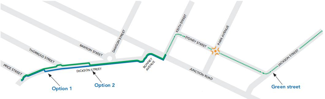 This third version is one we strongly support: it continues the protected cycleway along Dickson St (including a new priority crossing at Price St), crosses to avoid the roundabout, and turns toward the shops at Eagle Junction (but avoiding major driveway crossovers) to a new signalised crossing over busy Junction Road. From there the bike route will use low-traffic streets (Keith, Sydney, and Jackson Streets) with a variety of traffic calming treatments proposed.