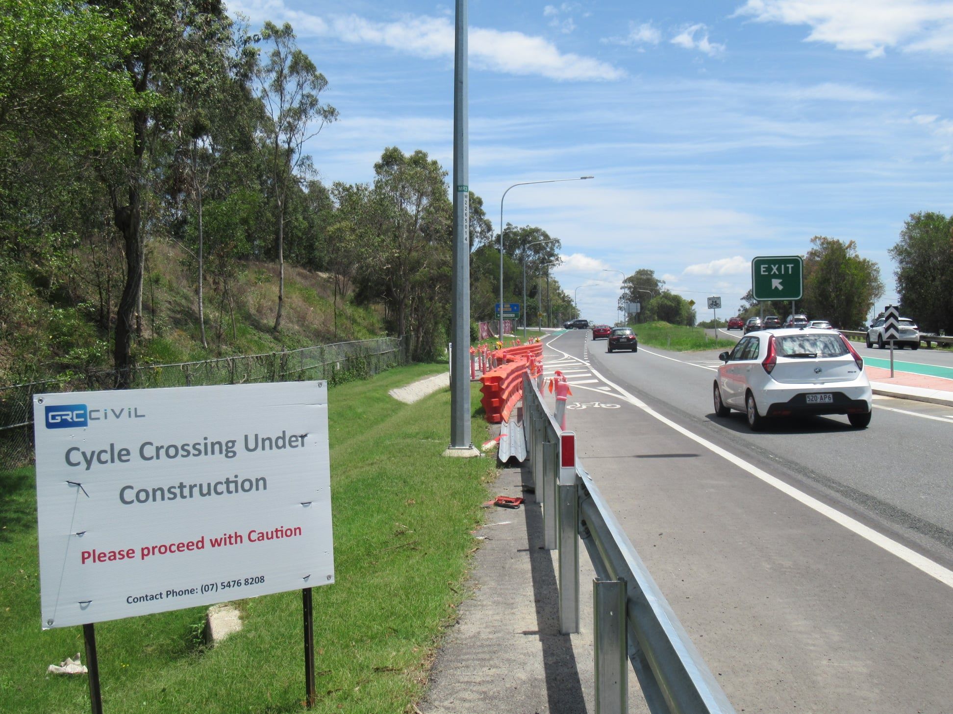 It has now been over a year since East BUG wrote to the Director General of Transport and Main Roads Queensland about the lack of provision for cycling on Old Cleveland Road (a principal cycle route) in the Gateway Motorway on-ramp “upgrade” project. The road-work speed limit now seems to have been lifted, but the cycle crossing is still not finished…