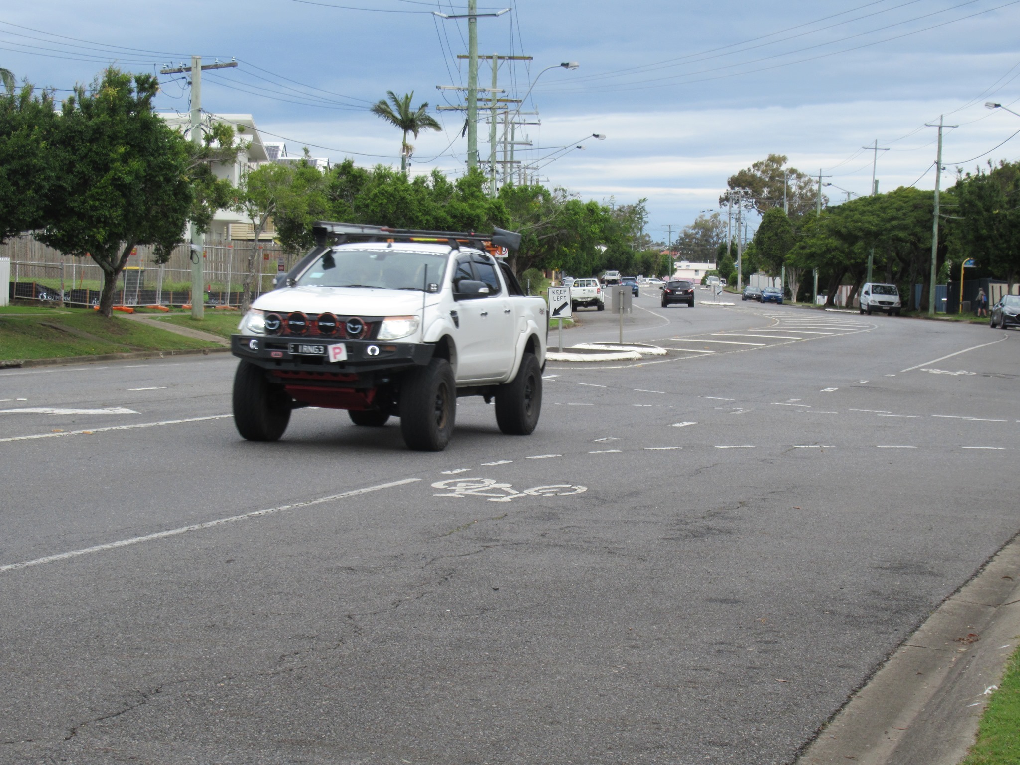 We note that the kerbside lanes are approximately 4m, which is indeed wider than is generally recommended for safety on urban roads. However, with a concrete centre median, or when a vehicle is in the adjacent turning lane, 4m is NOT enough width to allow a large vehicle to overtake a person on a bicycle while providing a legal 1m clearance.