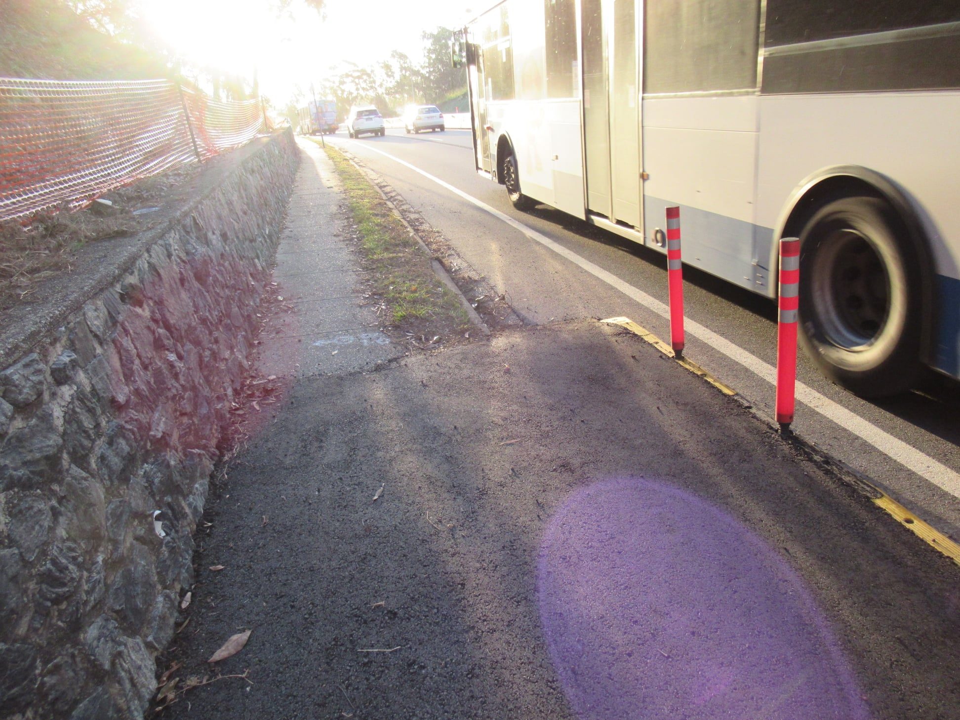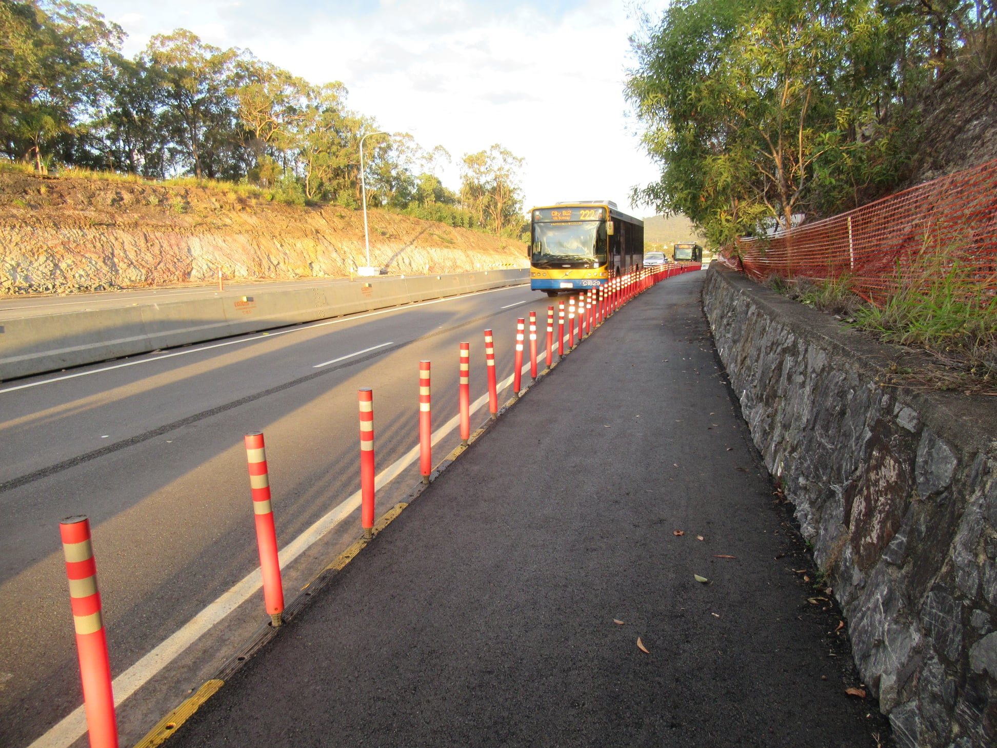 At least we now know why the temporary plastic barriers were place in the shoulder on Old Cleveland Road at Carina where Department of Transport and Main Roads (Queensland) are doing construction work for the Eastern Transitway. The shared path over the crest of the hill is nice and smooth, although if you want to cycle on the road either side, the ramps on and off are quite narrow.