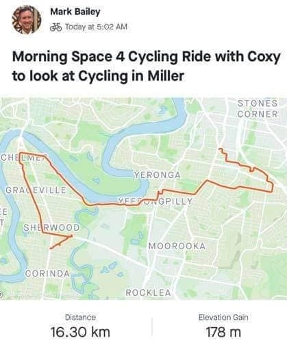 As Minister for Transport and Main Roads, Mark Bailey MP, Labor‘s Member for Miller has a busy schedule, but he found time to join Chris on a (very early) ride on Wednesday to check out some of the issues for active transport in his local electorate.