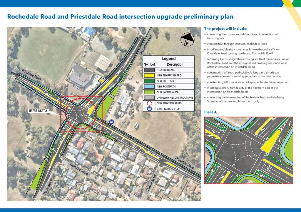 Also in Rochedale: there are 5 schools and a large child care centre within 500m of the intersection of Rochedale and Priestdale Roads, so unsurprisingly it gets very busy at the start and end of each school day. Brisbane City Council and Logan City Council have jointly agreed to convert it from a single lane roundabout to a multi-lane signalised intersection, with the help of funding from the Australian Government as part of their Urban Congestion Fund program.