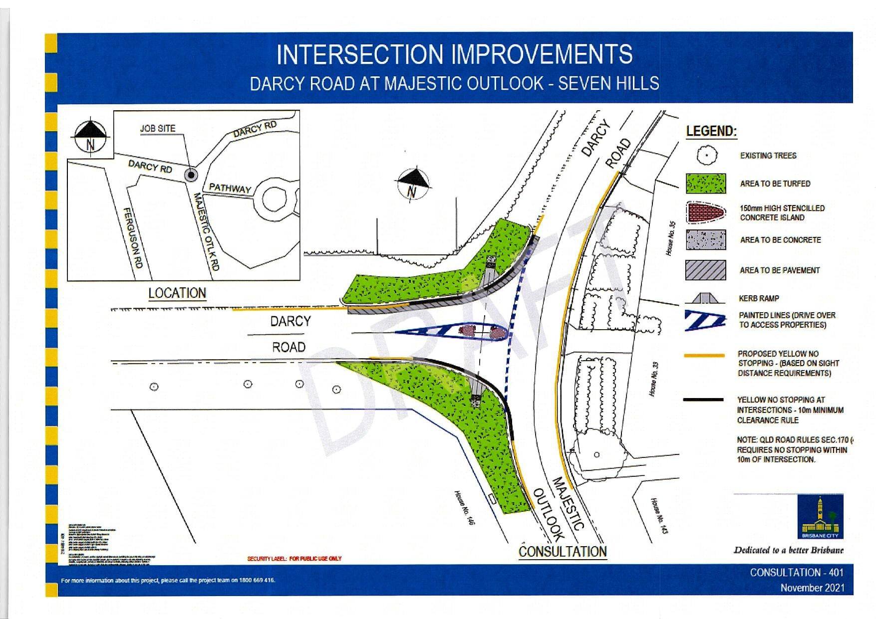 “Brisbane City Council is seeking your feedback about proposed traffic improvements in your area. The D’Arcy Road and Majestic Outlook intersection in Seven Hills, has been identified as a location in the local road network that would benefit from works to improve motorist and pedestrian safety.”