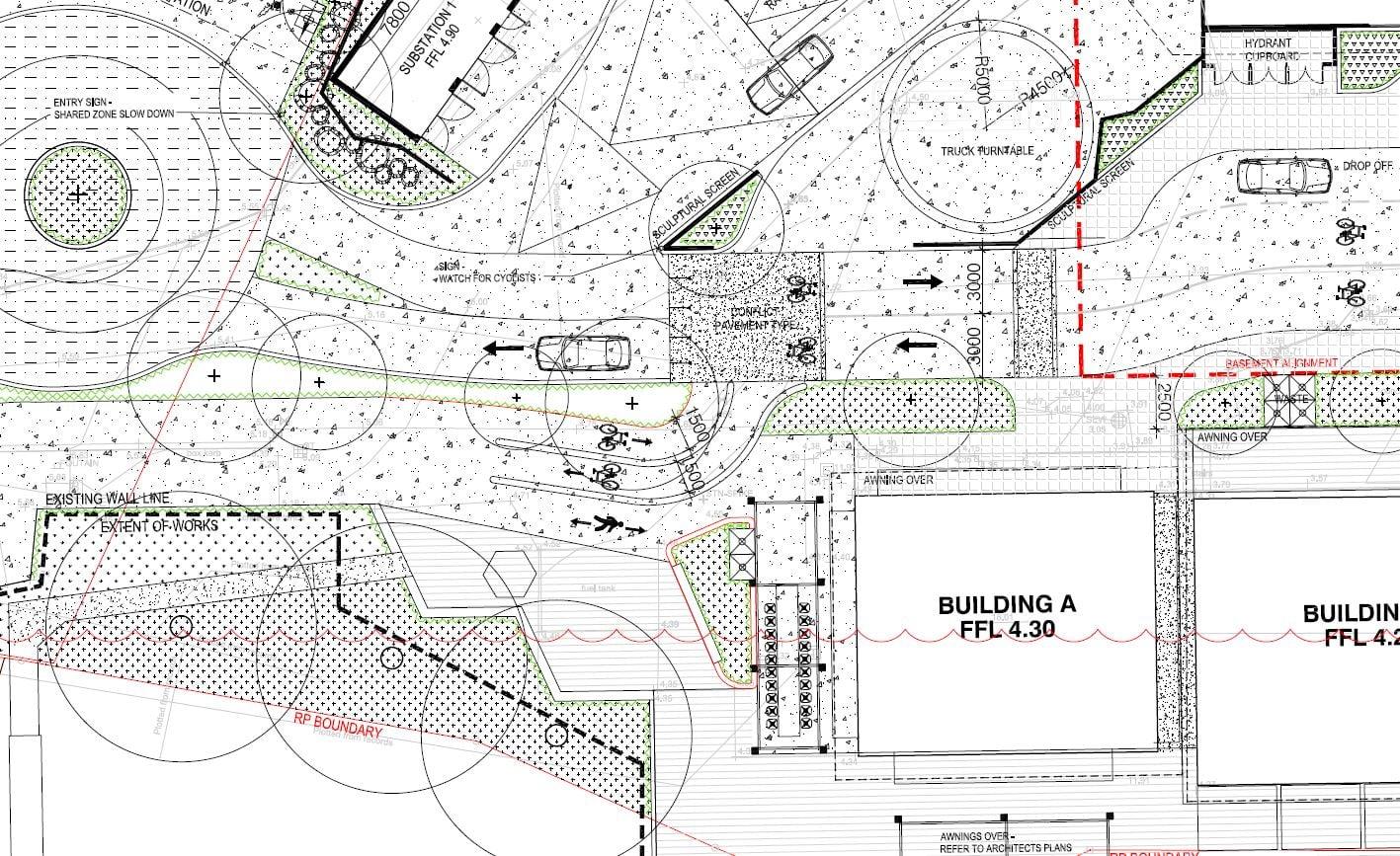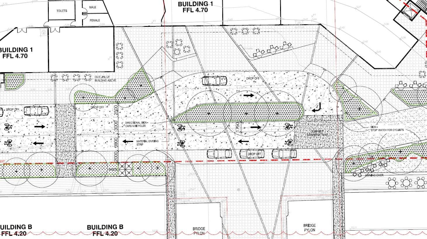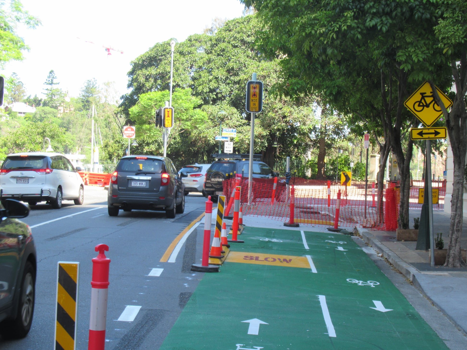 - The plans for the roadway space under the Story Bridge required a 1.75m wide bike lane to the right of the landscaped island, and with a “material dividing strip” separating that bike traffic from the cars exiting the pick-up/drop-off area. That has not been included, so people attempt to cycle straight ahead toward the Riverwalk are often confronted by drivers coming at them head-on.