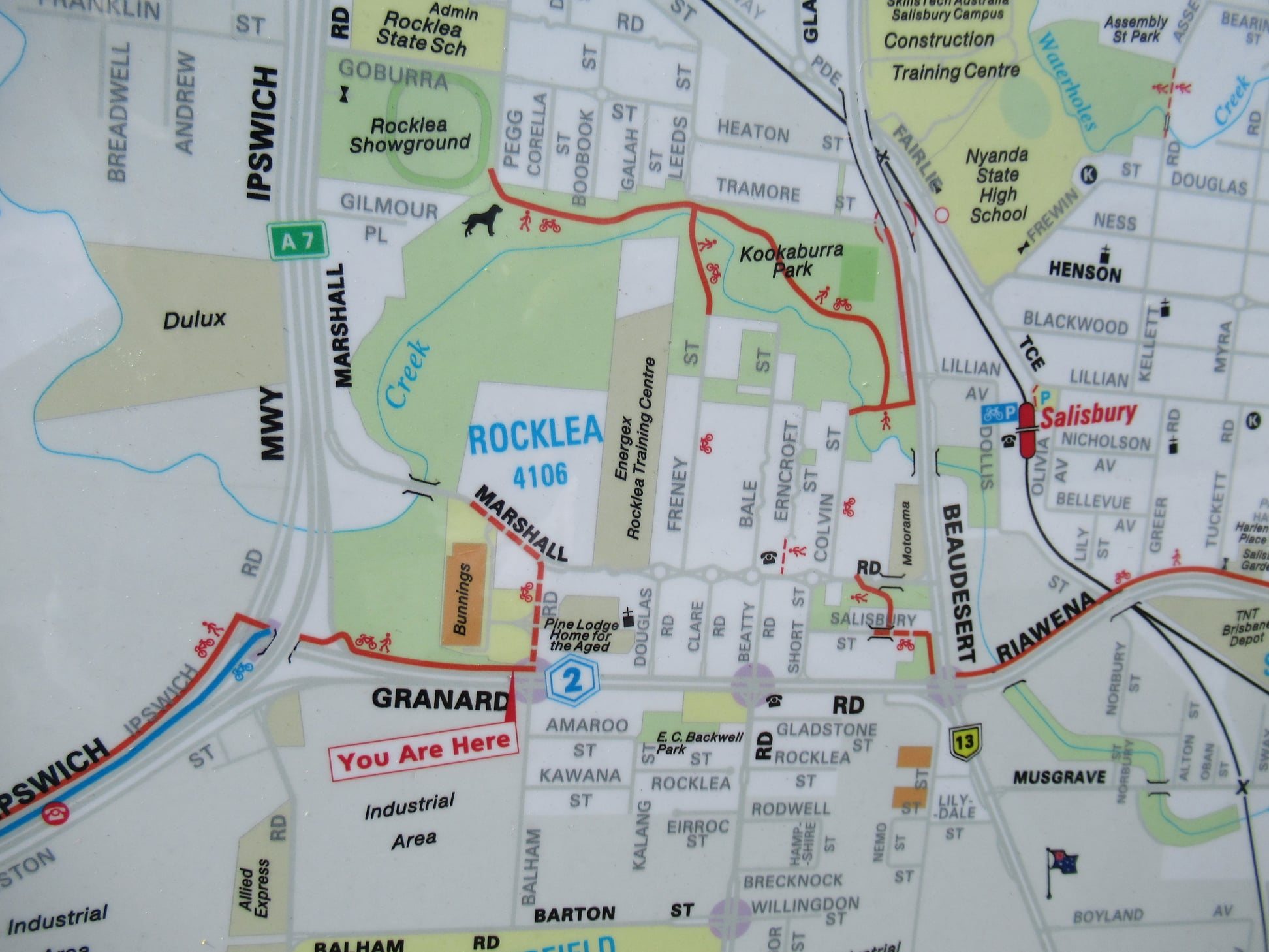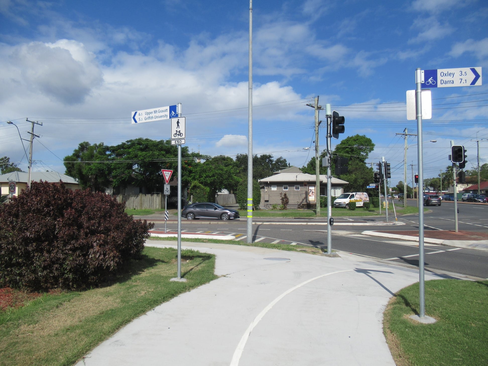 The finishing touches took a while due to availability of materials, but it’s good to see the Granard Rd cycle connection between Ipswich Rd and Balham Rd, Rocklea is now complete. (The directional signage to Oxley and Darra is out by 90 degrees though.)