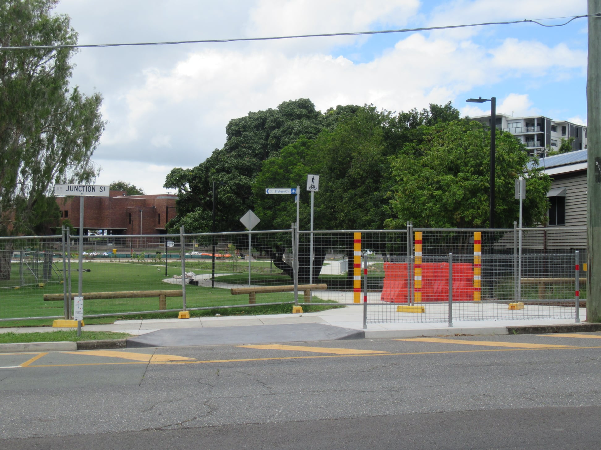 Nearby, this is a not-so-great piece of infrastructure at Stones Corner: the main connection between the Norman Creek Bikeway and the V1 Veloway (plus the PA Hospital Bikeway towards Dutton Park and the Eleanor Schonell Bridge) is via Fern St. But Brisbane City Council have designed the path from Hanlon Park in a way which will make crossing Junction St really awkward. We understand that they want to prevent people cycling straight out onto Junction St without checking for traffic (and as usual, motor vehicle traffic is prioritised), but we don’t think forcing people through an awkward dog-leg is a good solution.