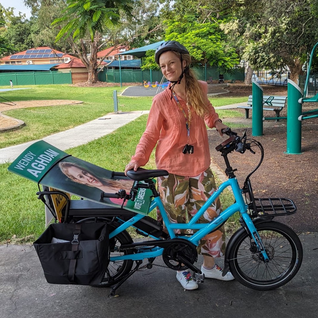 Brisbane CBD BUG started preparing early for the March 2024 elections: last year, Mary and Donald rode with Wendy Aghdam – The Greens candidate for Central Ward. Starting at Teneriffe, they followed the river into the CBD, rode the CityLink Cycleway, re-joined the Bicentennial Bikeway, and then rode back up at North Quay and through the Roma St Parklands to Gregory Terrace to finish in Victoria Park.