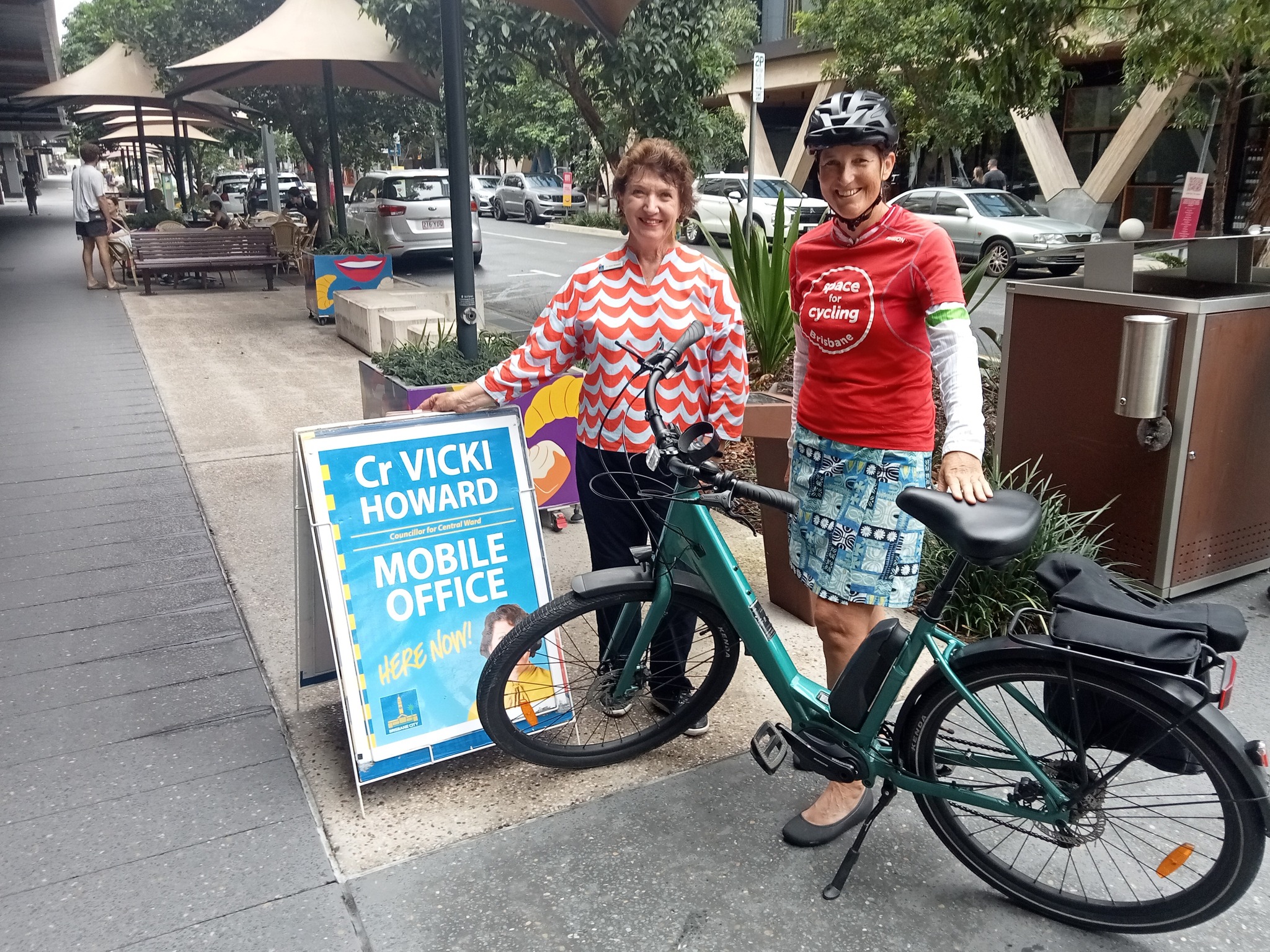 It’s easy to recognise people and stop for a chat when you travel by bike! Belinda caught up with Cr Vicki Howard (LNP candidate for Central Ward) at a mobile office in Bowen Hills on the way home from the Breakfast Creek green bridge opening event. We know Brisbane CBD BUG have a meeting lined up to talk with Cr Howard about a range of issues specific to Central Ward, but for now we wanted to emphasise the need to extend the CityLink Cycleway – especially into Fortitude Valley which is currently a real black-spot for active transport.