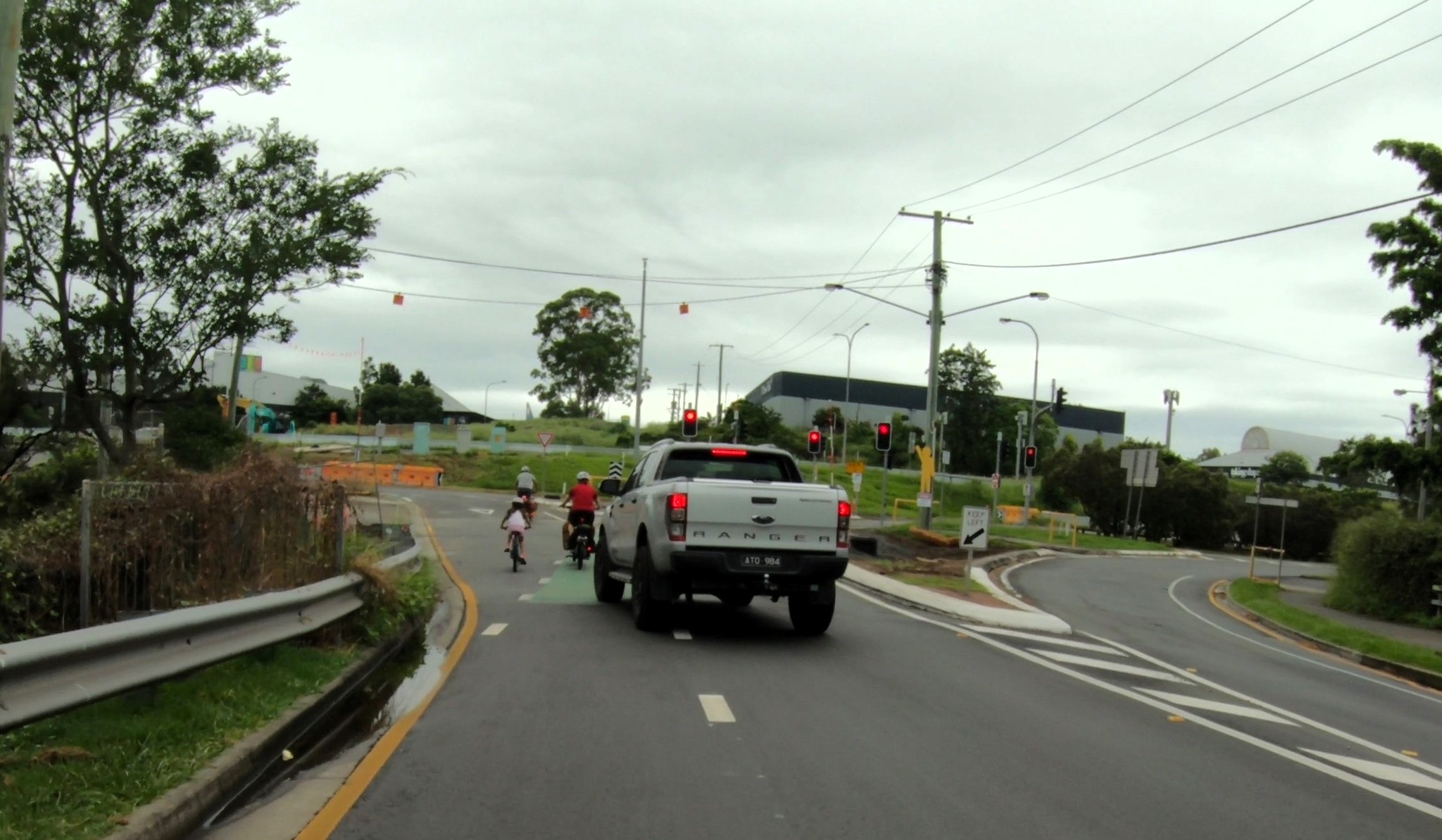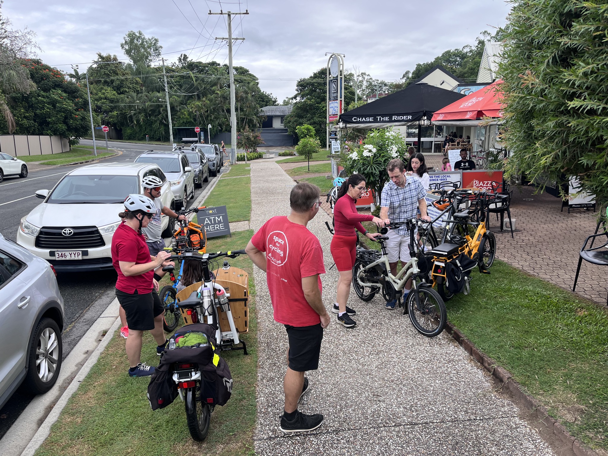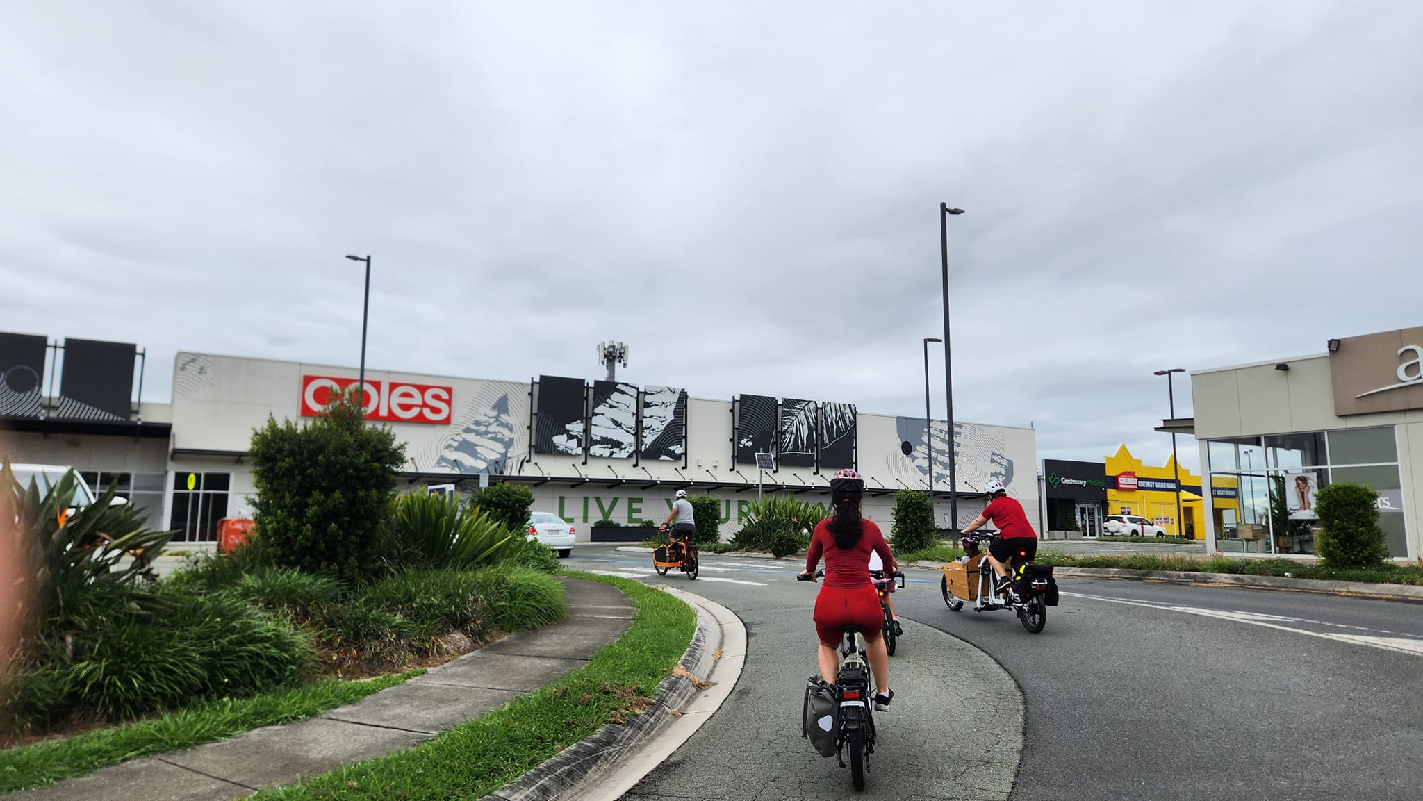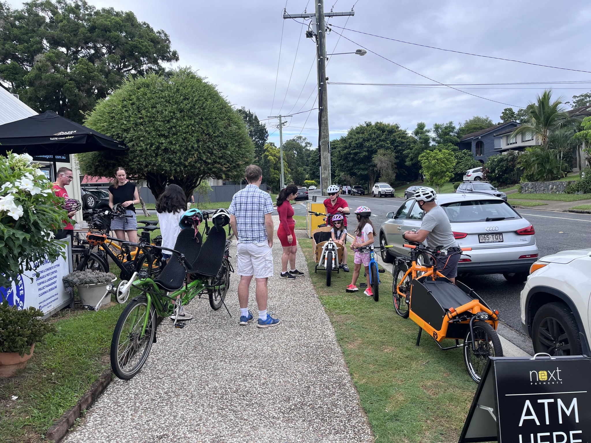 The group rode from Chase the Rider coffee shop in Jindalee, via the Jindalee Boat Ramp and through the lovely back streets along the river before battling the mess that is the construction of the Centenary Bridge duplication and Kooringal Drive bridge replacement projects. Next stop was the Jindalee Home shopping centre and a chance to pick up some tasty treats from the bakery for the kids. They returned to the starting point after a quick look at Jindalee Pool, and the hostile 60kph Yallambee road. Aaron, Os, Erica and Chris all recounted stories of near misses along that road – which is on the Principal Cycle Network Plan but lacking any safe infrastructure despite linking the pool, more shops, and Centenary State High School.
