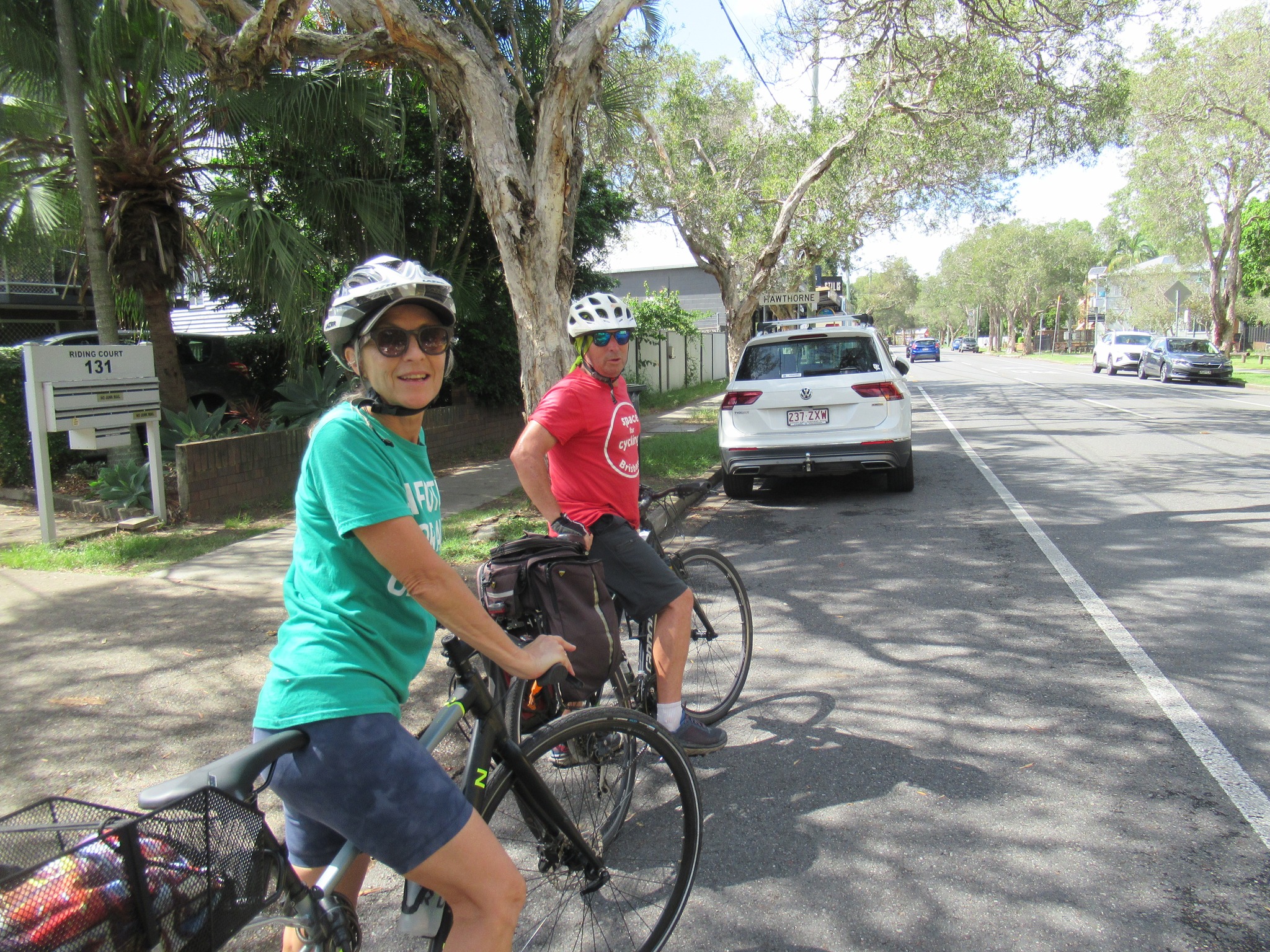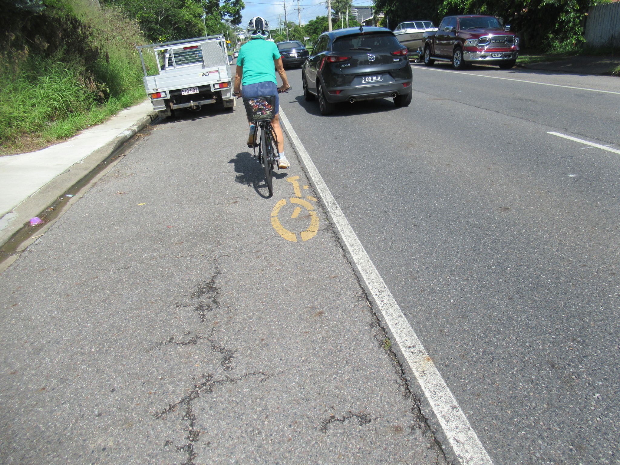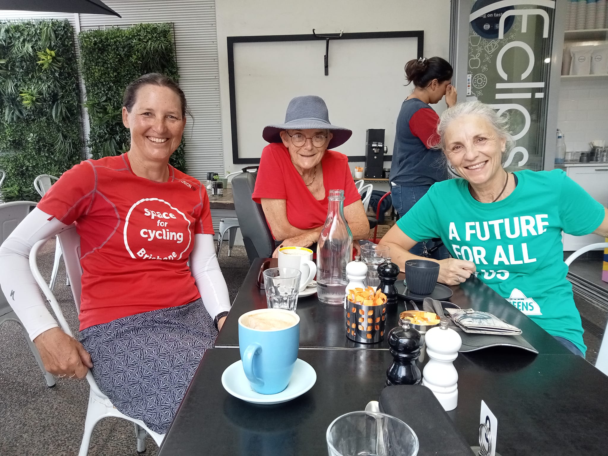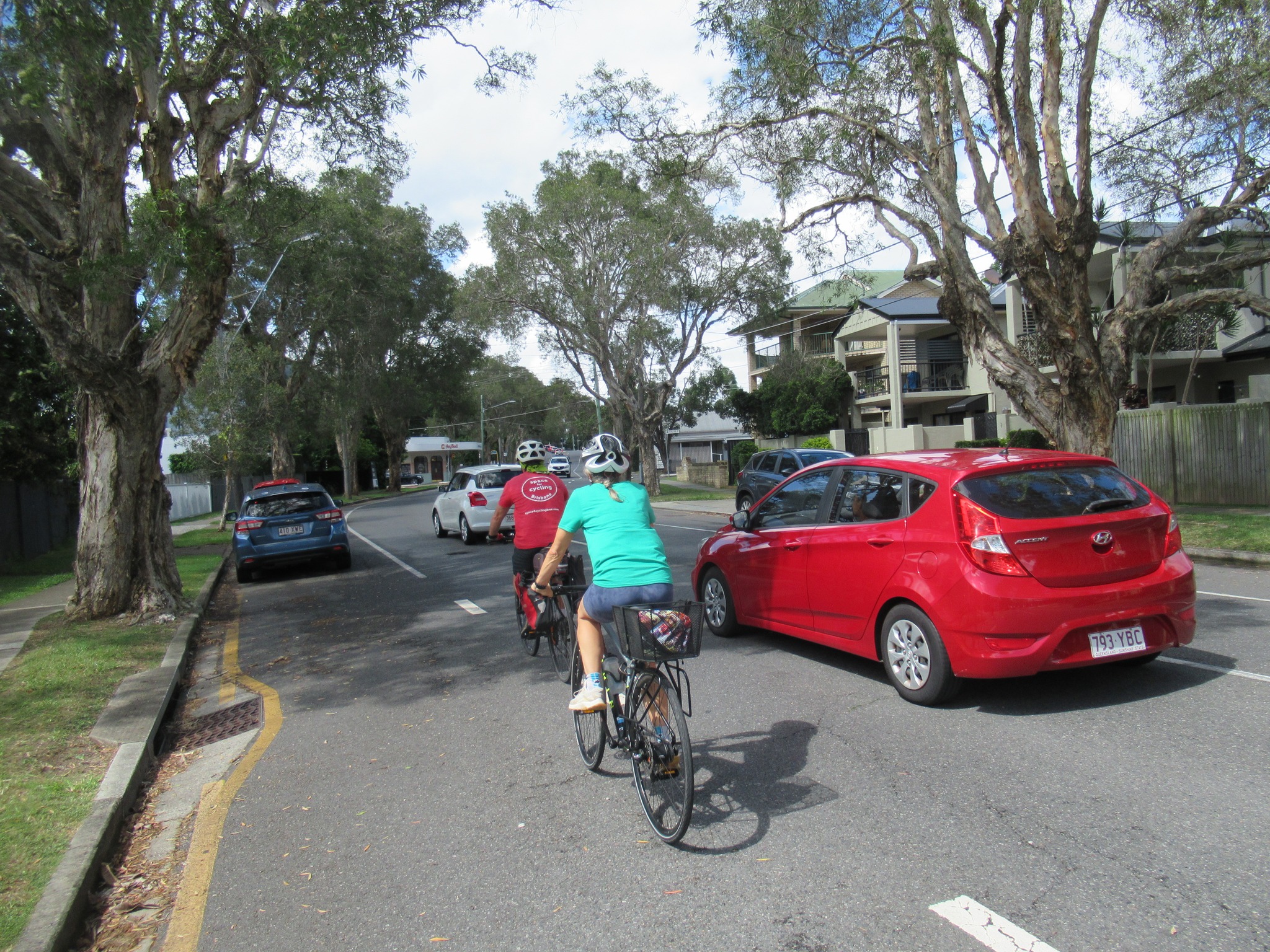 In Morningside Ward, Greens candidate Linda Barry deserves kudos for joining Belinda and Rolf from East BUG on a loop around the ward that included sections along Lytton Rd, Riding Rd, Hawthorne Rd, Wynnum Rd, Baringa St, and Junction Rd. Even on a Sunday morning, those roads are busy, and there are squeeze points where riding on the road places you right next to cars and trucks, but the footpath is either unsuitable for riding, or missing altogether. Some of these roads are marked in Council’s maps as having “on-road bike lanes” but that simply doesn’t match reality; if there are vehicles parked in the space, it’s not a bike lane!